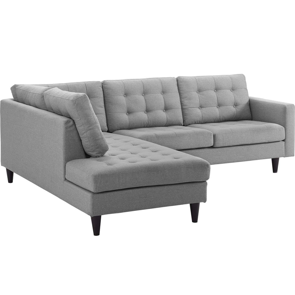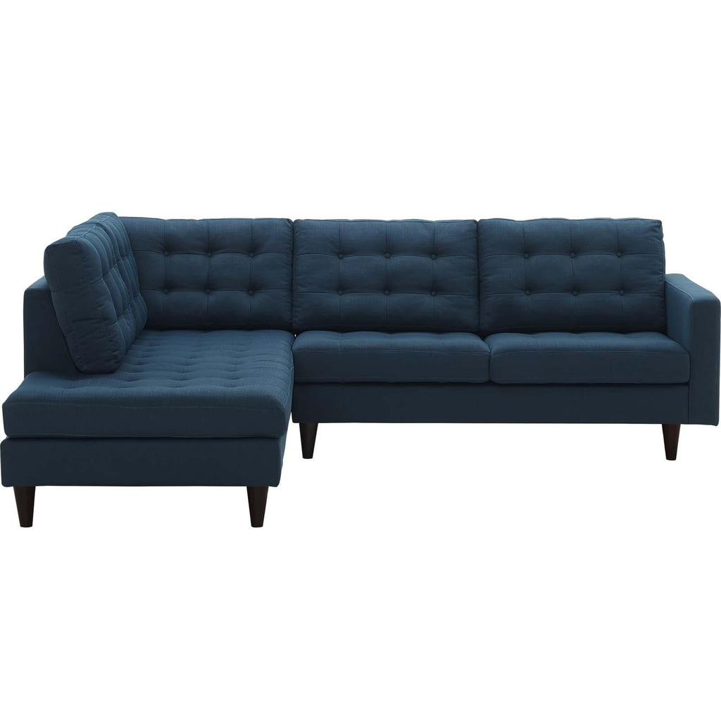 End the rule of unjust sovereignties that wage a useless war for your interiors. Empress Button Tufted Upholstered Fabric Sectional Sofa Set leaves the would-be heiress of holistic furnishings in the dust with a design that rivals any competitor. Empress is a 2 piece left facing bumper sectional sofa set heralded with deeply tufted buttons, plush cushions, and armrests that convey that perfect air of nobility. The solid wood legs come with plastic glides to prevent floor scratching, and support the solidly constructed wood frame of this sectional sofa set. Dense foam padding create a luxe seating experience while the durable and stain-resistant fine fabric upholstery leaves the recipients feeling richly rewarded. Maximum Weight Capacity: 660 lbs. Set Includes: One - Empress Left Facing Bumper One - Empress Right-Facing Loveseat Mid-Century Left Bumper Chaise/Right-Facing Loveseat Deeply Tufted Buttons Fine Polyester Upholstery Plastic Foot Glides Solid Wood Legs Some Assembly Required Maximum Weight Capacity: 660 Overall Right-Facing Loveseat Dimensions: 64.5"L x 34"W x 34"H Armrest Dimensions: 4.5"W x 25.5"H Cushion Thichkness: 6"W Overall Left Facing Bumper Dimensions: 36.5"L x 84"W x 35.5"H Floor to Top of Seat: 19"H Overall Product Dimensions: 84"L x 101"W x 35.5"H