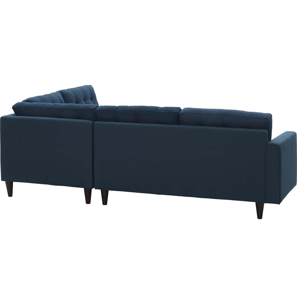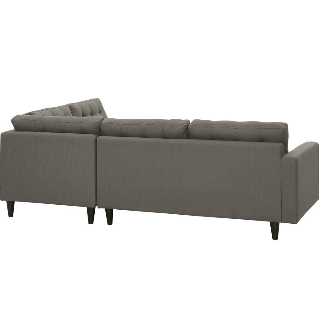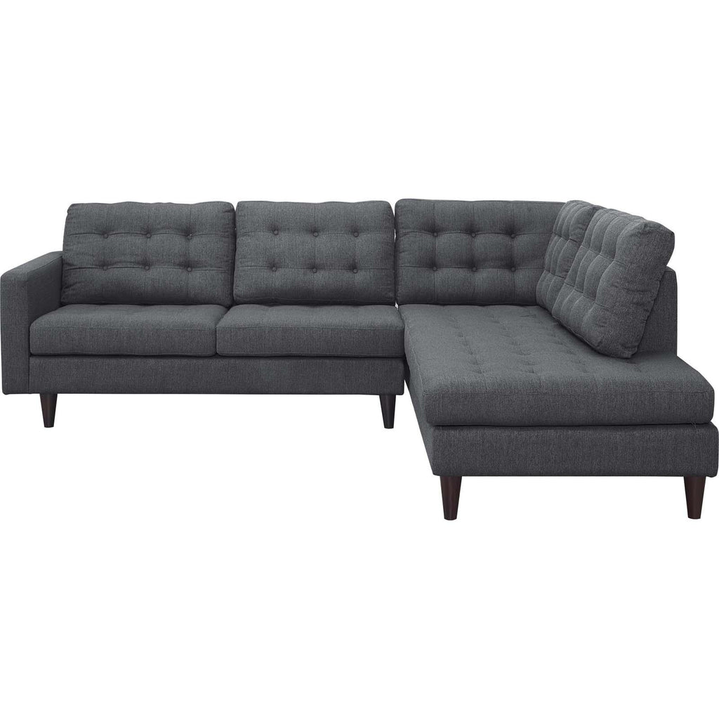 End the rule of unjust sovereignties that wage a useless war for your interiors. Empress Button Tufted Upholstered Fabric Sectional Sofa Set leaves the would-be heiress of holistic furnishings in the dust with a design that rivals any competitor. Empress is a 2 piece right facing bumper sectional sofa set heralded with deeply tufted buttons, plush cushions, and armrests that convey that perfect air of nobility. The solid wood legs come with plastic glides to prevent floor scratching, and support the solidly constructed wood frame of this sectional sofa set. Dense foam padding create a luxe seating experience while the durable and stain-resistant fine fabric upholstery leaves the recipients feeling richly rewarded. Maximum Weight Capacity: 660 lbs.