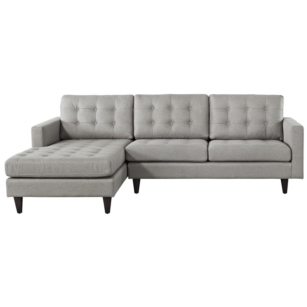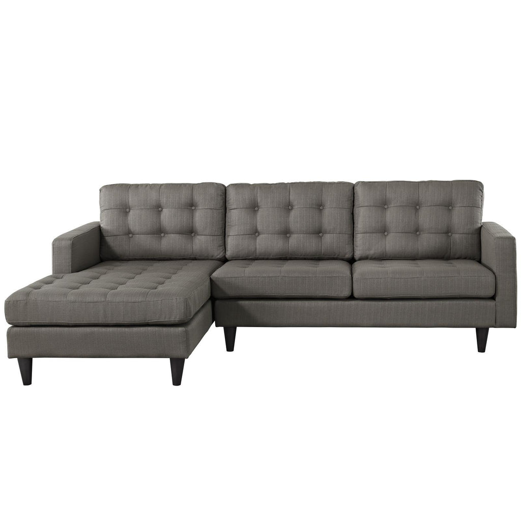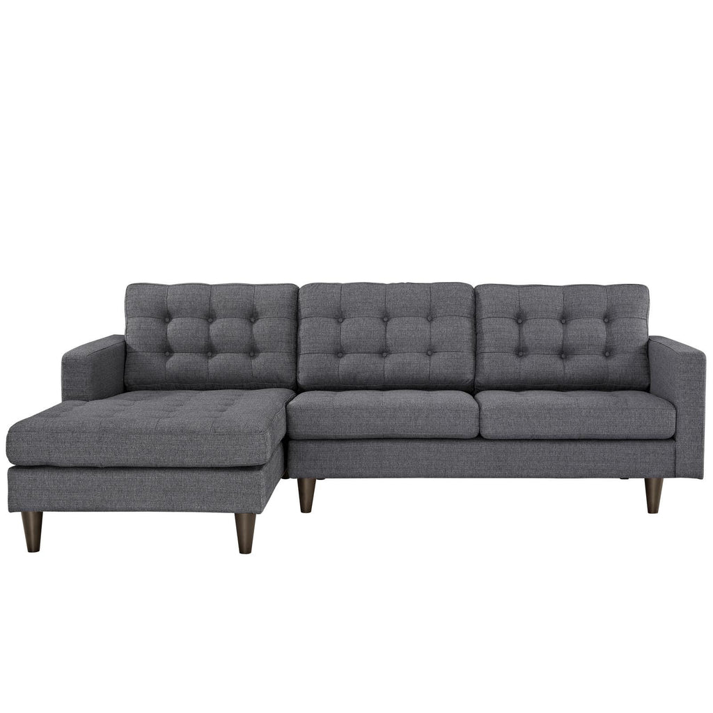 End the rule of unjust sovereignties that wage a useless war for your interiors. Empress leaves the would-be heiress of holistic furnishings in the dust with a design that rivals any competitor. Empress is heralded with deeply tufted buttons, plush cushions, and armrests that convey that perfect air of nobility. The solid wood legs come with plastic glides to prevent floor scratching, and the fine fabric upholstery leaves the recipients feeling richly rewarded. Set Includes: One - Empress Left-Arm Sectional Sofa Modern left-side chair and loveseat Deeply tufted buttons Fine polyester upholstery Plastic foot glides Solid rubberwood legs Spot clean only Some assembly required suspension - seat is S spring and rubber band Overall Product Dimensions: 60.5"L x 99.5"W x 34"H Loveseat Dimensions: 64.5"L x 35.5"W x 35.5"H Chaise Dimensions: 35.0"L x 63.5"W x 35.5"H Loveseat Seat Cushion Size: 26.5"L x 27.5"W x 6"H Back Cushion Size: 26.5"L x 18.5"W x 6"H Chaise Seat Cushion Size: 31.5"L x 53.5"W x 6"H Seat Height: 18.5"H Arm Height: 25.5"H