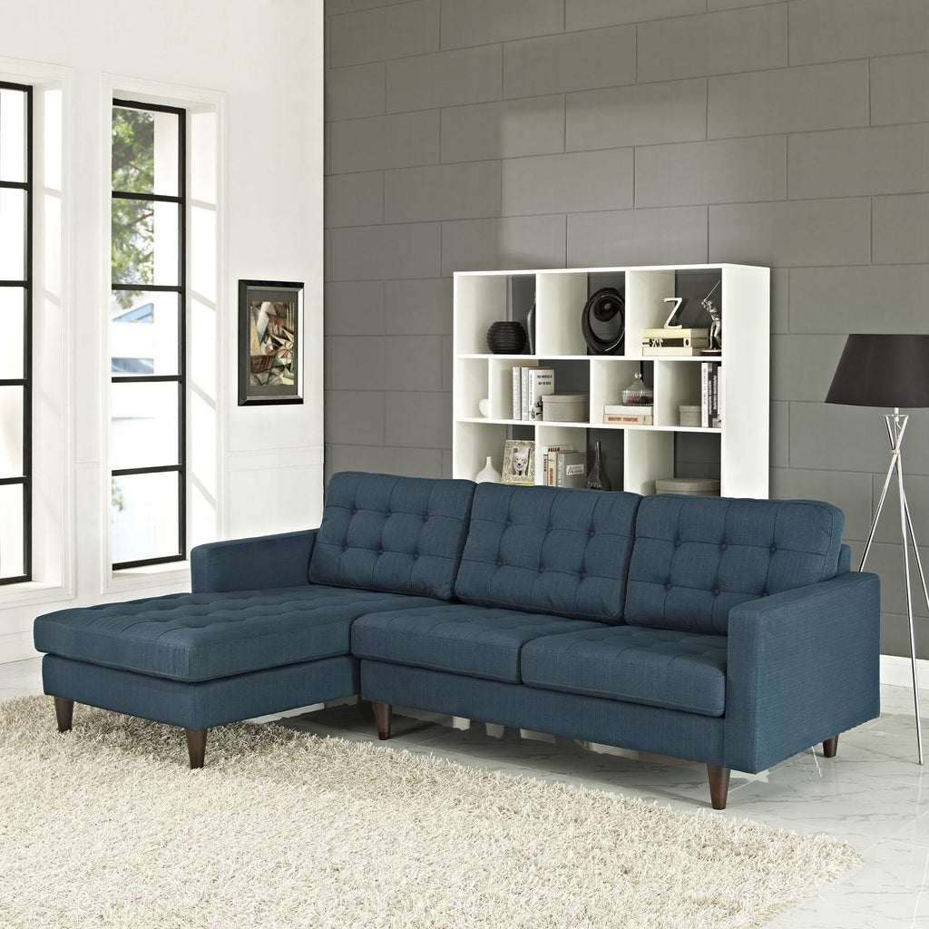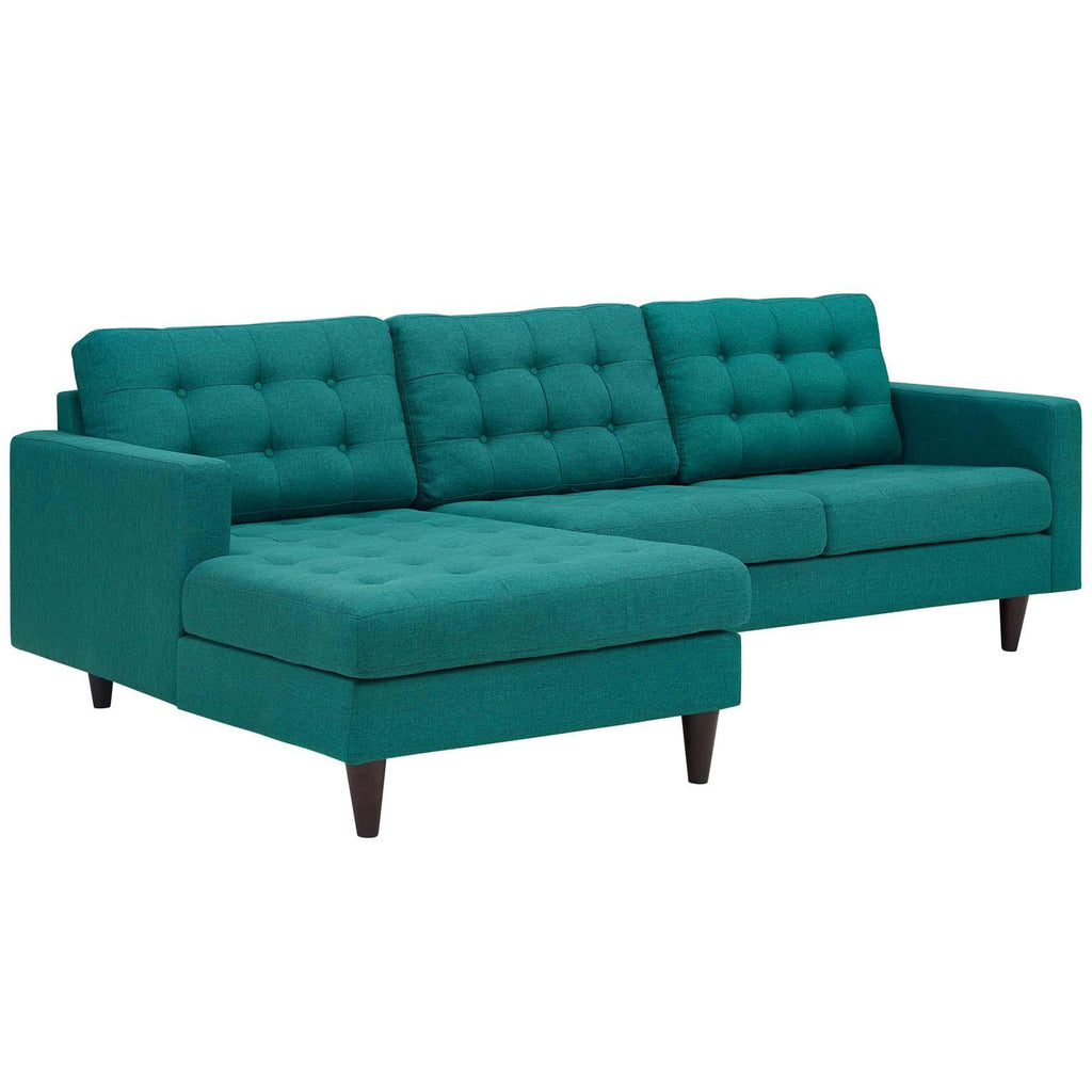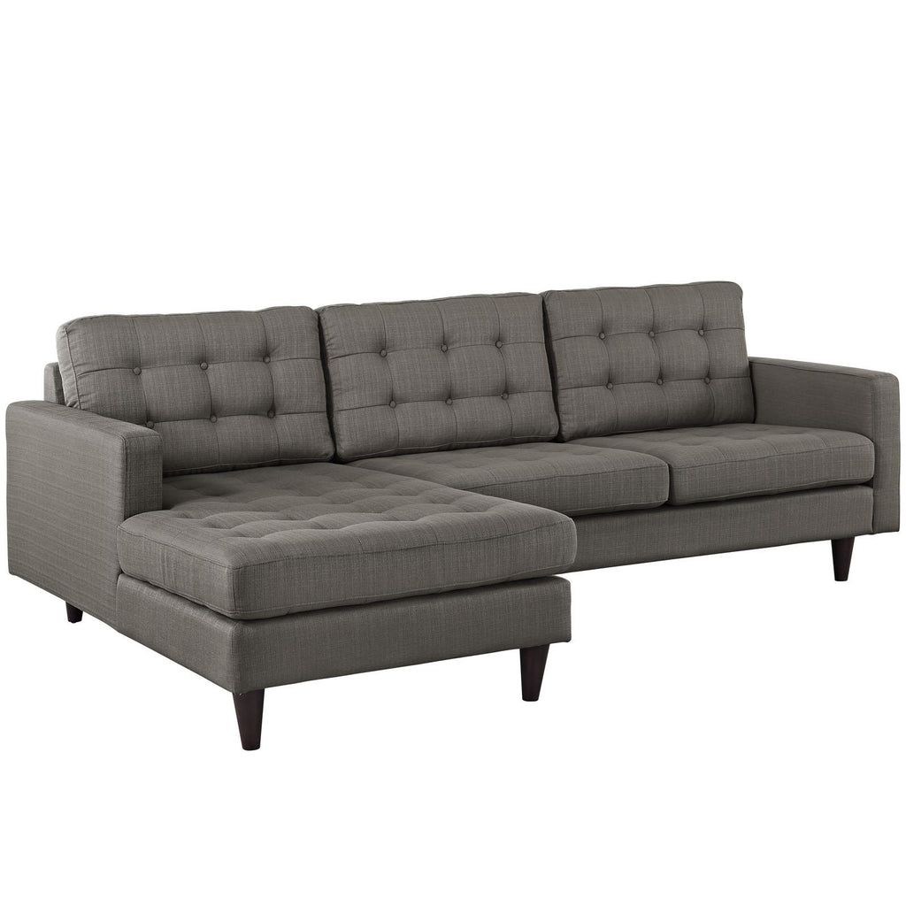 End the rule of unjust sovereignties that wage a useless war for your interiors. Empress leaves the would-be heiress of holistic furnishings in the dust with a design that rivals any competitor. Empress is heralded with deeply tufted buttons, plush cushions, and armrests that convey that perfect air of nobility. The solid wood legs come with plastic glides to prevent floor scratching, and the fine fabric upholstery leaves the recipients feeling richly rewarded. Set Includes: One - Empress Left-Arm Sectional Sofa Modern left-side chair and loveseat Deeply tufted buttons Fine polyester upholstery Plastic foot glides Solid rubberwood legs Spot clean only Some assembly required suspension - seat is S spring and rubber band Overall Product Dimensions: 60.5"L x 99.5"W x 34"H Loveseat Dimensions: 64.5"L x 35.5"W x 35.5"H Chaise Dimensions: 35.0"L x 63.5"W x 35.5"H Loveseat Seat Cushion Size: 26.5"L x 27.5"W x 6"H Back Cushion Size: 26.5"L x 18.5"W x 6"H Chaise Seat Cushion Size: 31.5"L x 53.5"W x 6"H Seat Height: 18.5"H Arm Height: 25.5"H