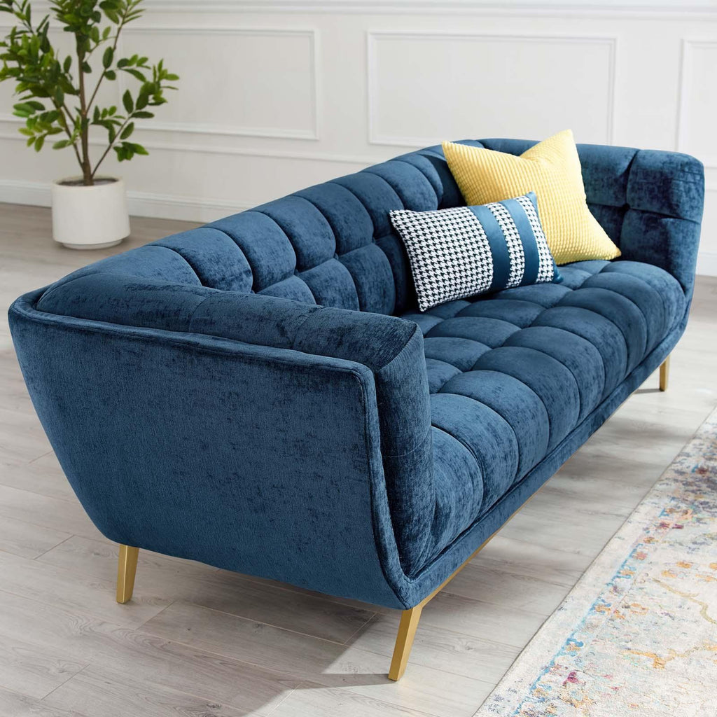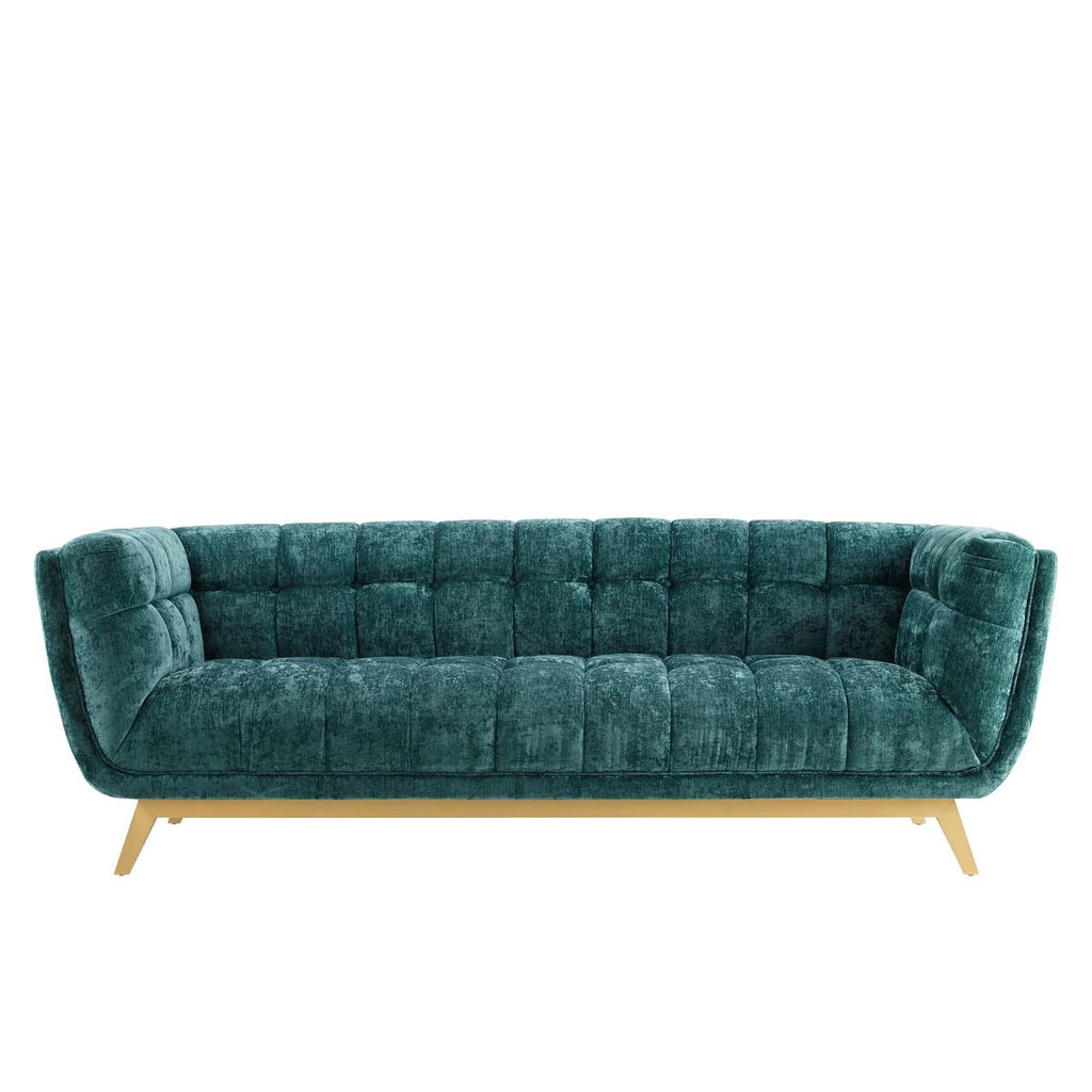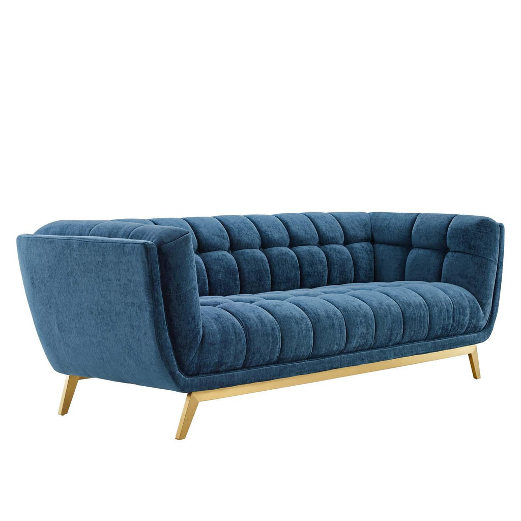 Generously update your d�cor with Bestow Crushed Performance Velvet Sofa. Uniquely designed with a striking broad profile, Bestow comes in soft, stain-resistant performance velvet polyester upholstery with a crushed texture, dense foam padding, and elegant button tufting. Sturdily positioned on brushed gold splayed stainless steel legs with non-marking foot caps, Bestow boasts a bountiful living room seating design brimming with possibilities. With ample seat depth and overscaled frame, invite all your guests to sit comfortably in this 12" high back and armrest collection perfect for mid-century, vintage modern, or contemporary d�cors. Weight Capacity: 900 lbs.