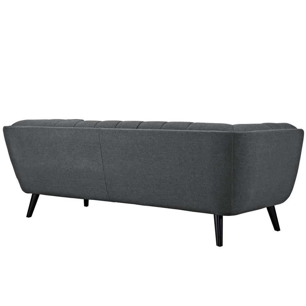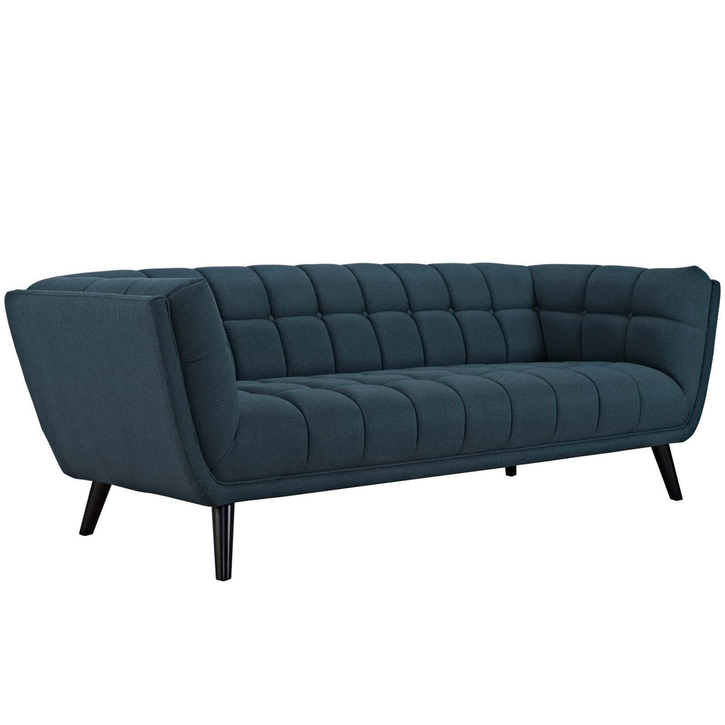 Generously update your d�cor with Bestow. Uniquely designed with a striking broad profile, Bestow comes finely upholstered in t polyester fabric with dense foam padding and elegant button tufting. Sturdily positioned on splayed and tapered black finish wood legs with non-marking foot caps, Bestow boasts a bountiful living room seating design brimming with possibilities. With ample seat depth and overscaled frame, invite all your guests to sit comfortably in this 12" high back and armrest collection perfect for mid-century, modern farmhouse, or contemporary d�cors.