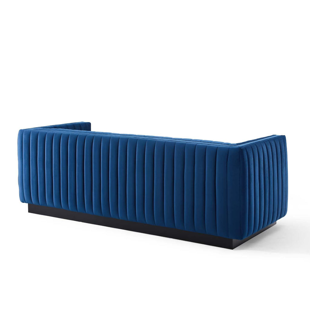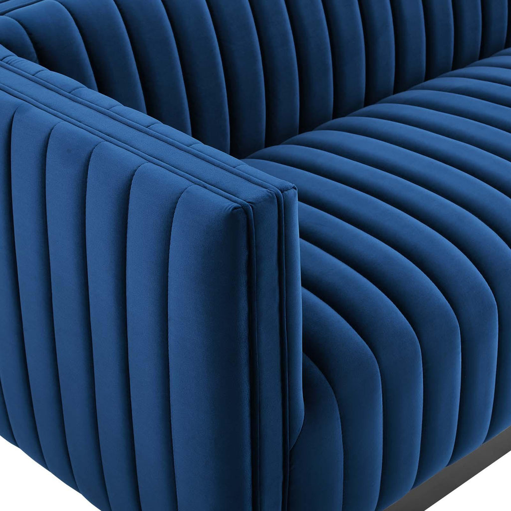 Magnetic appeal surrounds the Conjure Channel Tufted Performance Velvet Upholstered Sofa. Luxuriously soft stain-resistant performance velvet upholstery covers dense foam padding with an individually wrapped spring coil system to create a supportive living room couch that will become the go-to lounge spot for family and friends. Vertical channel tufting and subtle French piping on the arms adds depth to this vintage glamour sofa that effortlessly becomes the focal point in your living room. Solidly constructed from wood and plywood, the Conjure Living Room Sofa has non-marking foot caps and a matte black base. Versatile and elegant, the Conjure Performance Velvet Sofa is ideally suited for a variety of decor styles in your living room, lounge room, or home office. Sofa Weight Capacity: 1323 lbs.