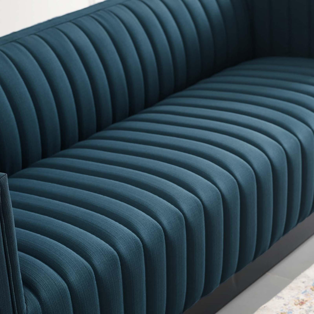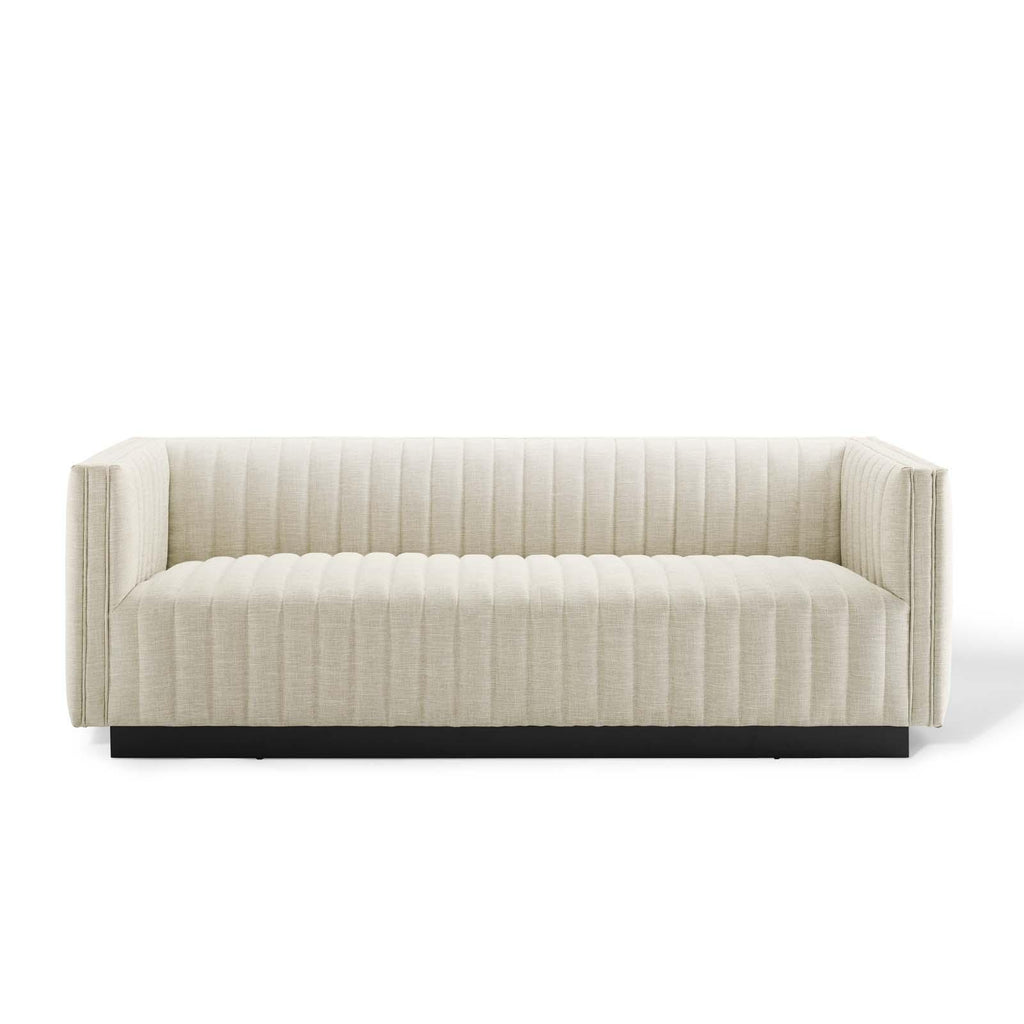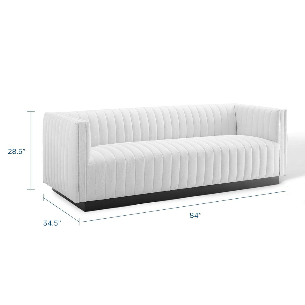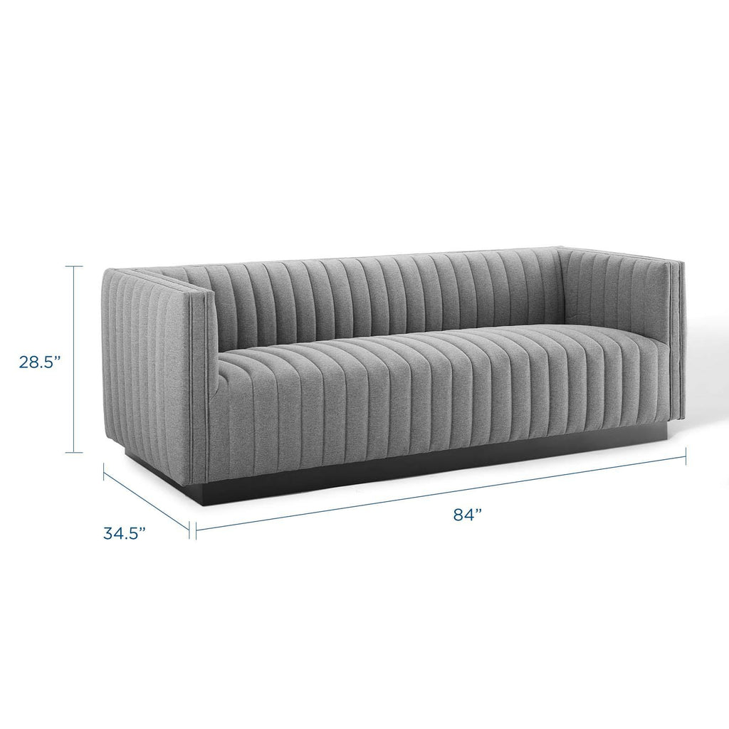 Magnetic cachet follows the organic linear design of the Conjure Channel Tufted Fabric Upholstered Living Room Sofa. Relax into the glam deco style and allow the streamlined effect of the vertical channel tufting details to direct your living room decor. Conjure Sofa adds a charming retro modern style to your living room, lounge room, or home office. Individually wrapped spring coils are covered with dense foam padding and a soft polyester fabric upholstery for a premium seating experience. This elegant living room couch rests securely on a matte black wooden base that complements any modern home or apartment. Sofa Weight Capacity: 1323 lbs. Comes Fully Assembled. Set Includes: One - Conjure Tufted Sofa Channel Tufting Accents Glam Deco Style Polyester Fabric Upholstery Dense Foam Padding Solid Wood Base Sofa Weight Capacity: 1323 lbs. Overall Product Dimensions: 34.5"L x 84"W x 28.5"H Seat Dimensions: 23"L x 84"W x 17.5"H Armrest Height from Seat: 11"H Backrest Dimensions: 84"W x 11"H