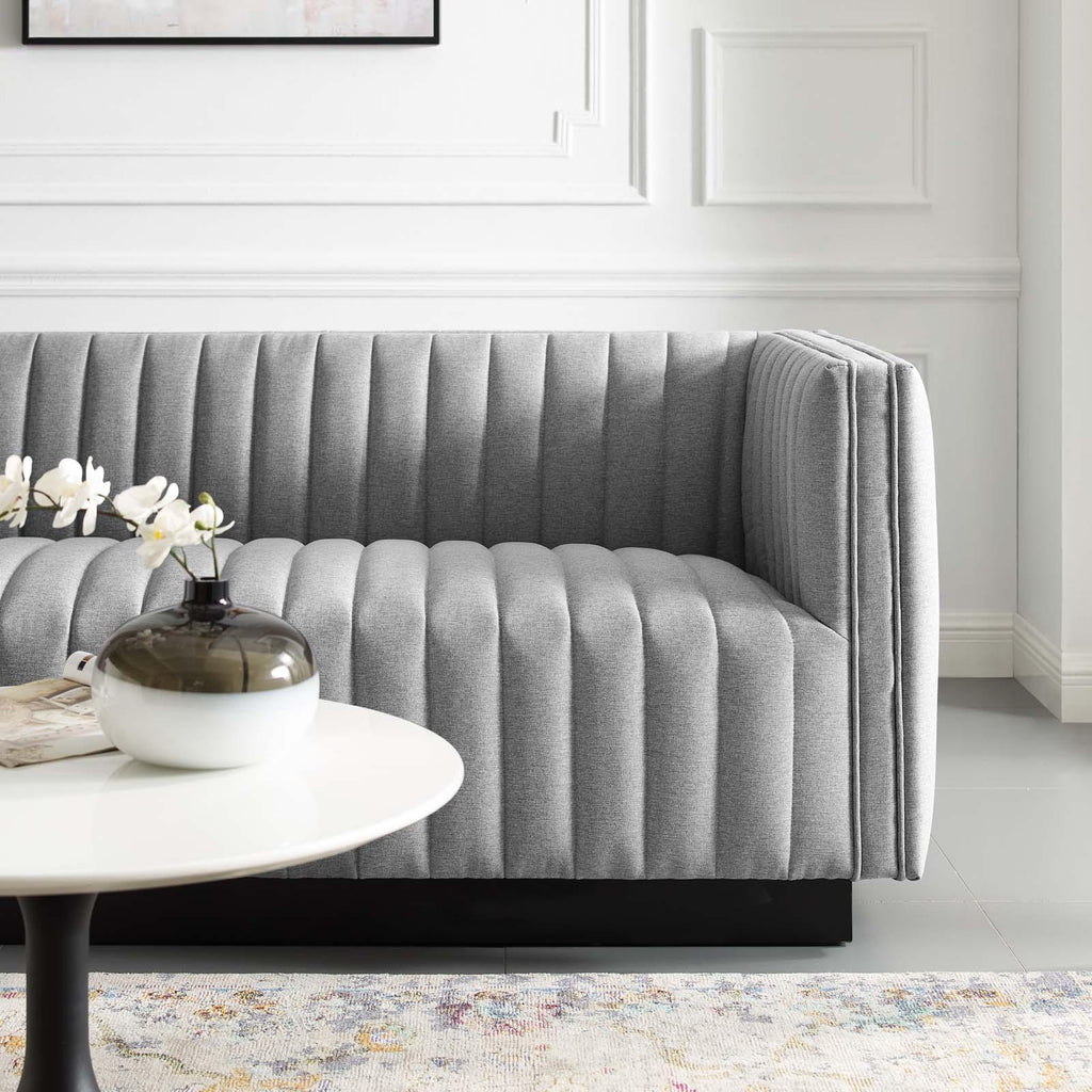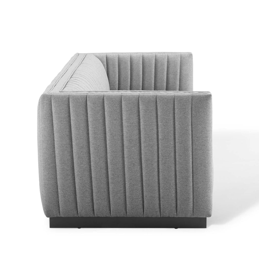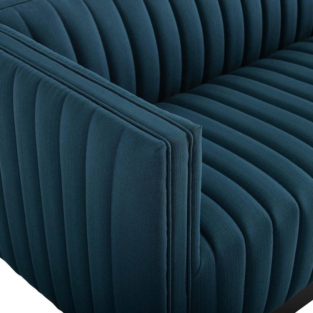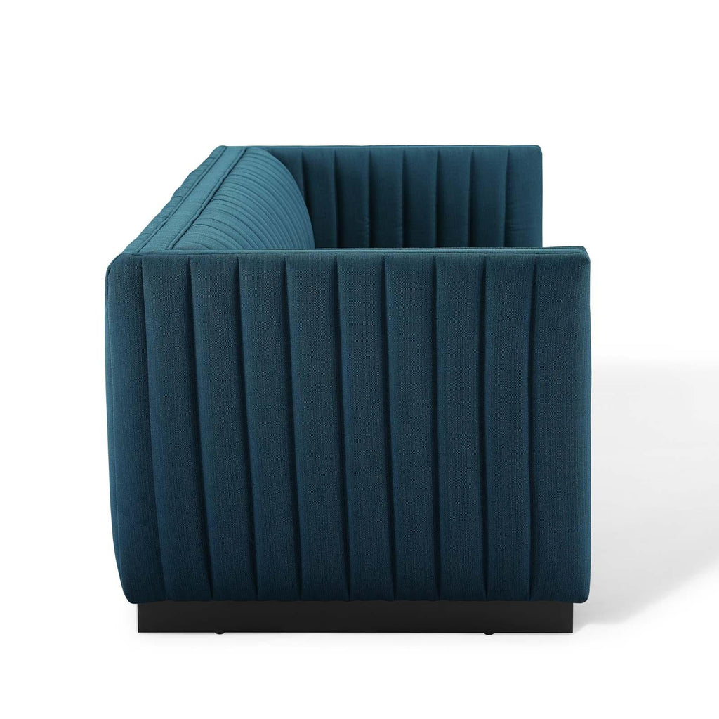 Magnetic cachet follows the organic linear design of the Conjure Channel Tufted Fabric Upholstered Living Room Sofa. Relax into the glam deco style and allow the streamlined effect of the vertical channel tufting details to direct your living room decor. Conjure Sofa adds a charming retro modern style to your living room, lounge room, or home office. Individually wrapped spring coils are covered with dense foam padding and a soft polyester fabric upholstery for a premium seating experience. This elegant living room couch rests securely on a matte black wooden base that complements any modern home or apartment. Sofa Weight Capacity: 1323 lbs. Comes Fully Assembled. Set Includes: One - Conjure Tufted Sofa Channel Tufting Accents Glam Deco Style Polyester Fabric Upholstery Dense Foam Padding Solid Wood Base Sofa Weight Capacity: 1323 lbs. Overall Product Dimensions: 34.5"L x 84"W x 28.5"H Seat Dimensions: 23"L x 84"W x 17.5"H Armrest Height from Seat: 11"H Backrest Dimensions: 84"W x 11"H