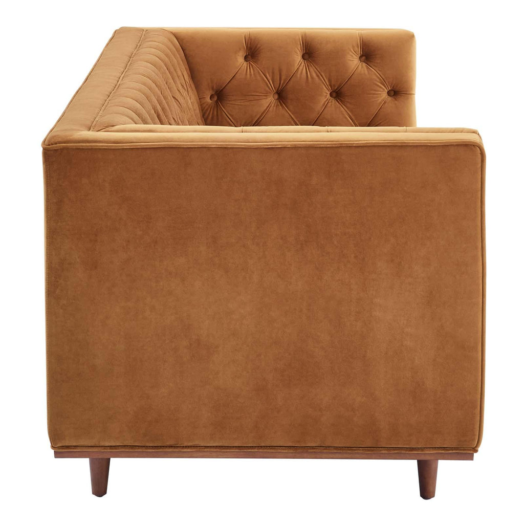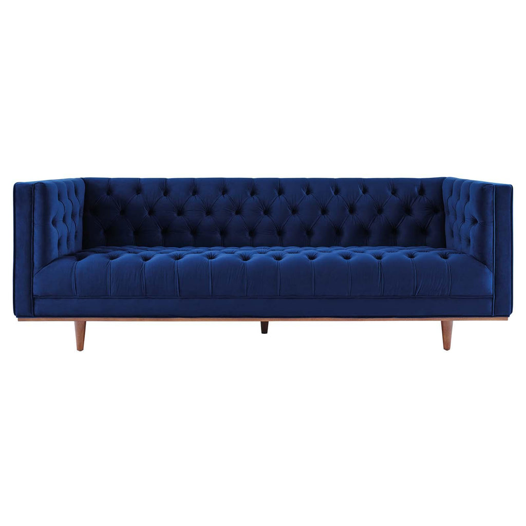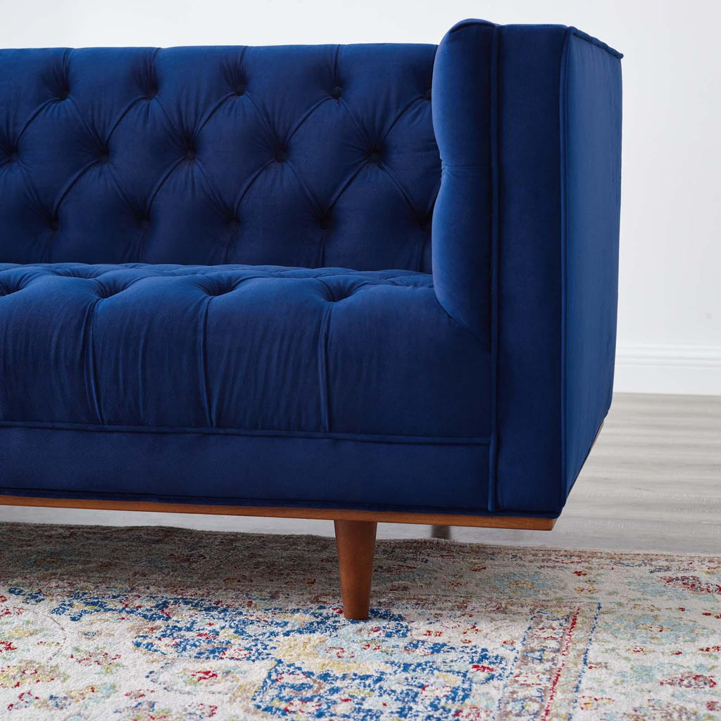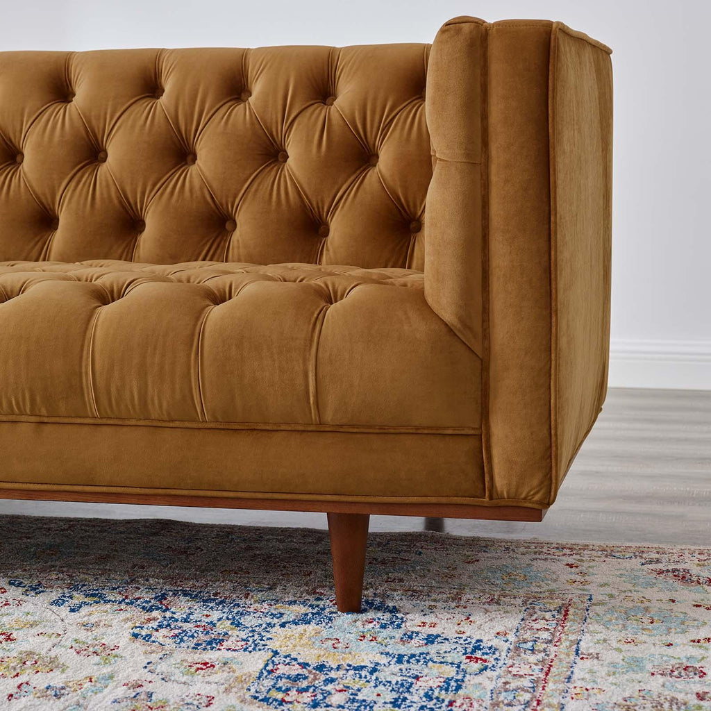 Inspire vintage modernity and glam deco style in your living space with the Elation Tufted Performance Velvet Sofa. Adorned with beautiful button tufting in an elegant diamond pattern, this living room sofa adds effortless depth to any lounge area. Elation is covered in stain-resistant performance velvet upholstery and features dense foam padding for a premium seating experience. With a durably crafted wood frame, this sofa rests atop tapered rubberwood legs. Includes non-marking foot caps. Assembly required. Sofa Weight Capacity: 881 lbs.