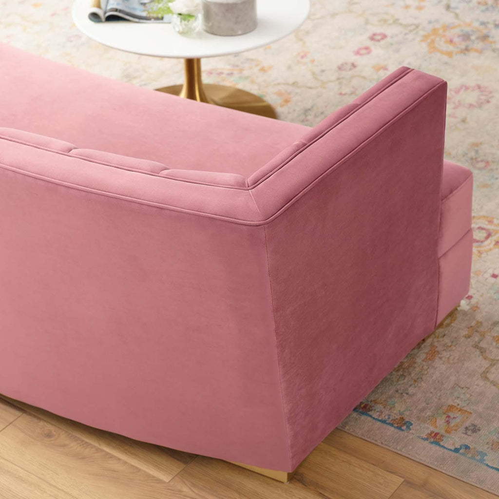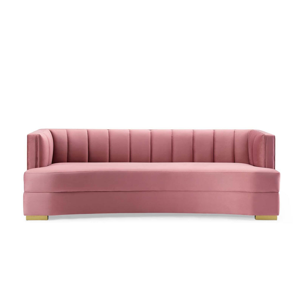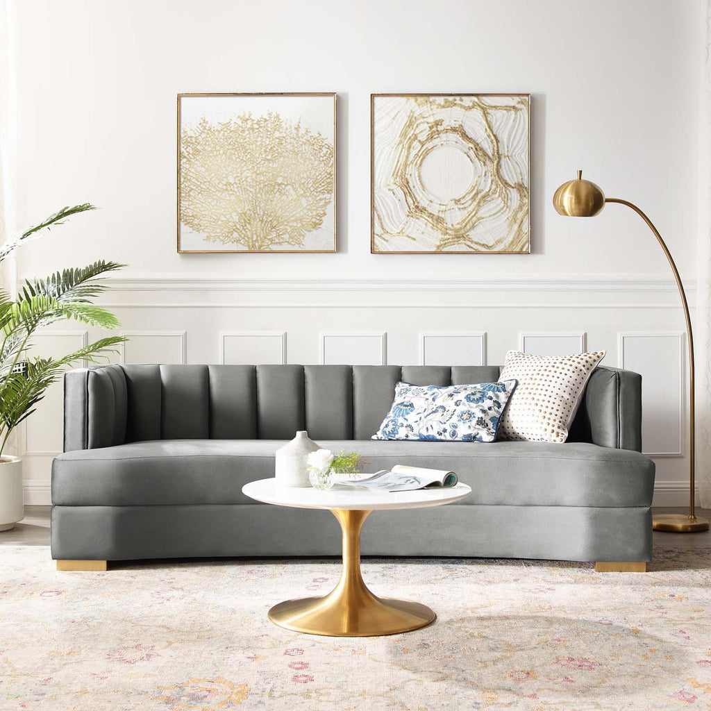 Bring the Encompass Curved Channel Tufted Performance Velvet Curved Sofa to your living room and claim center stage with the glam deco elegance. Encompass has a linear back and arms enhanced with interior vertical channel tufting accents. The curved seating expanse adds a welcoming appeal to the velvet couch. The Encompass Living Room Sofa has densely padded foam cushions covered with luxuriously soft stain-resistant performance velvet polyester upholstery creating a lushly comfortable seat. Four gold stainless steel legs with non-marking foot caps support the Encompass Couch. Assembly Required. Sofa Weight Capacity: 600 lbs.