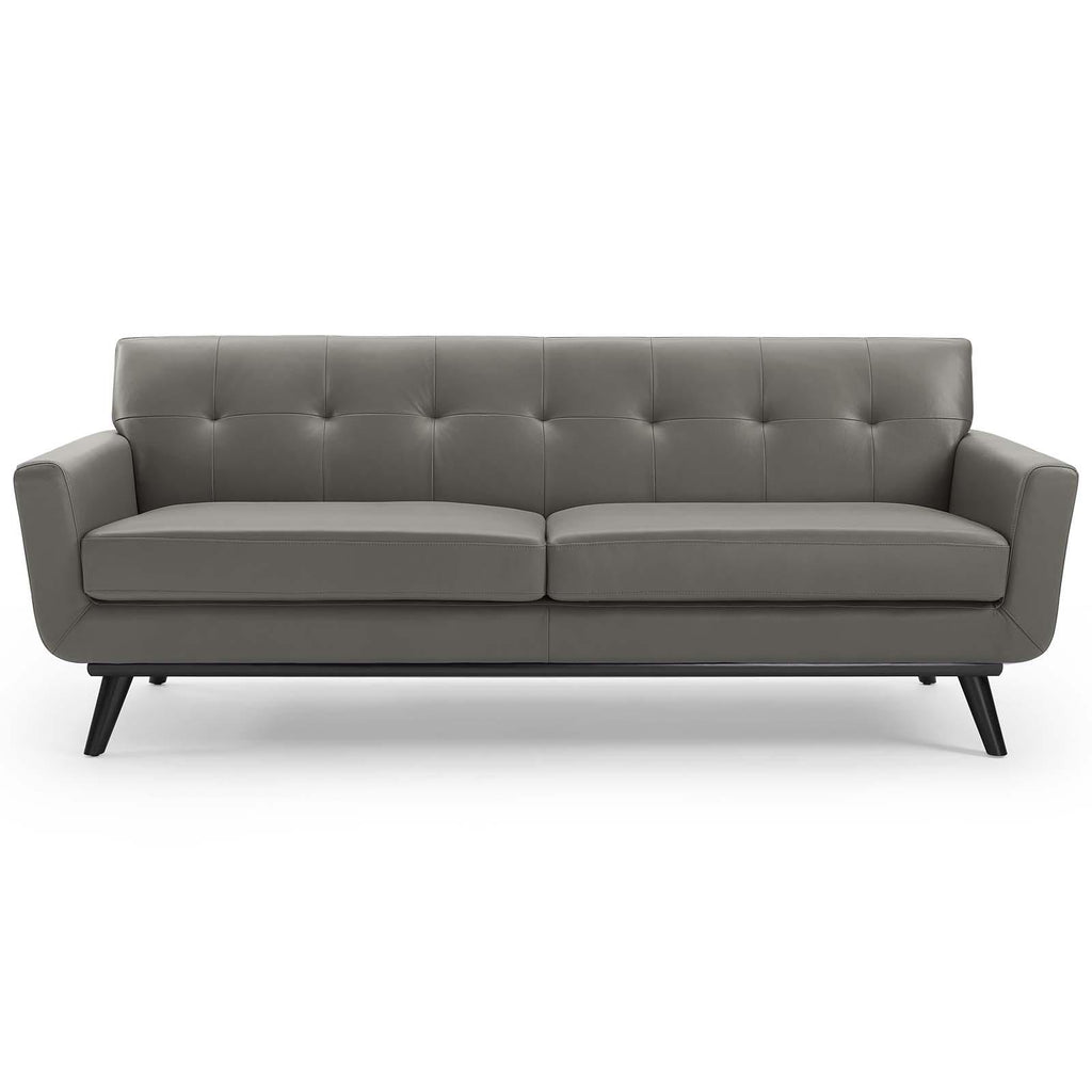 Gently sloping curves and plush removable seat cushions create a favorite living room couch. Whether lounging in solitude or entering a spirited discussion with friends, the Engage mid-century modern tufted top-grain leather upholstered living room lounge 90" sofa is a welcome presence in your home. Seven buttons create eye-catching appeal, adding depth to a sleek retro modern living room sofa that brings your sitting d�cor to center stage. Four splayed wood legs and frame supply a solid base to the comfortable quality leather couch for your living room, lounge room, office or other seating area. Sofa Weight Capacity: 552 lbs.