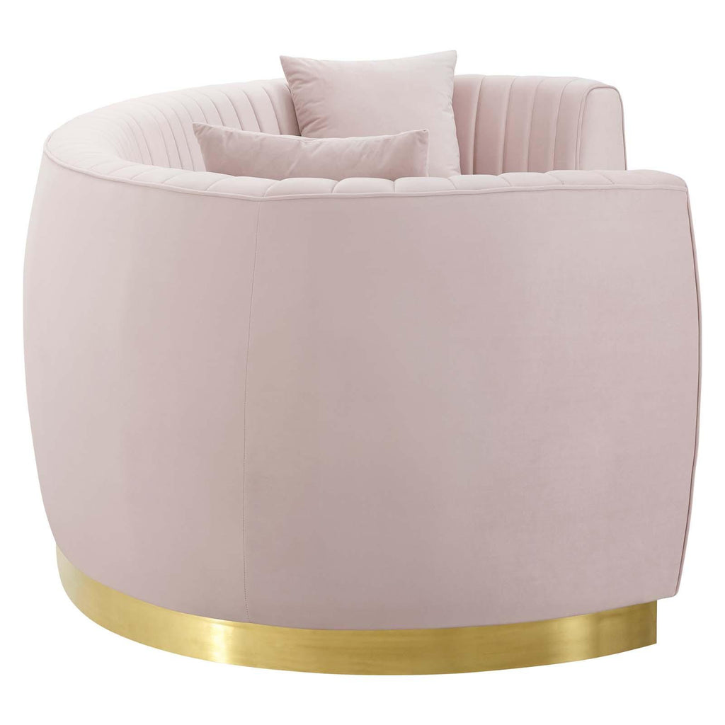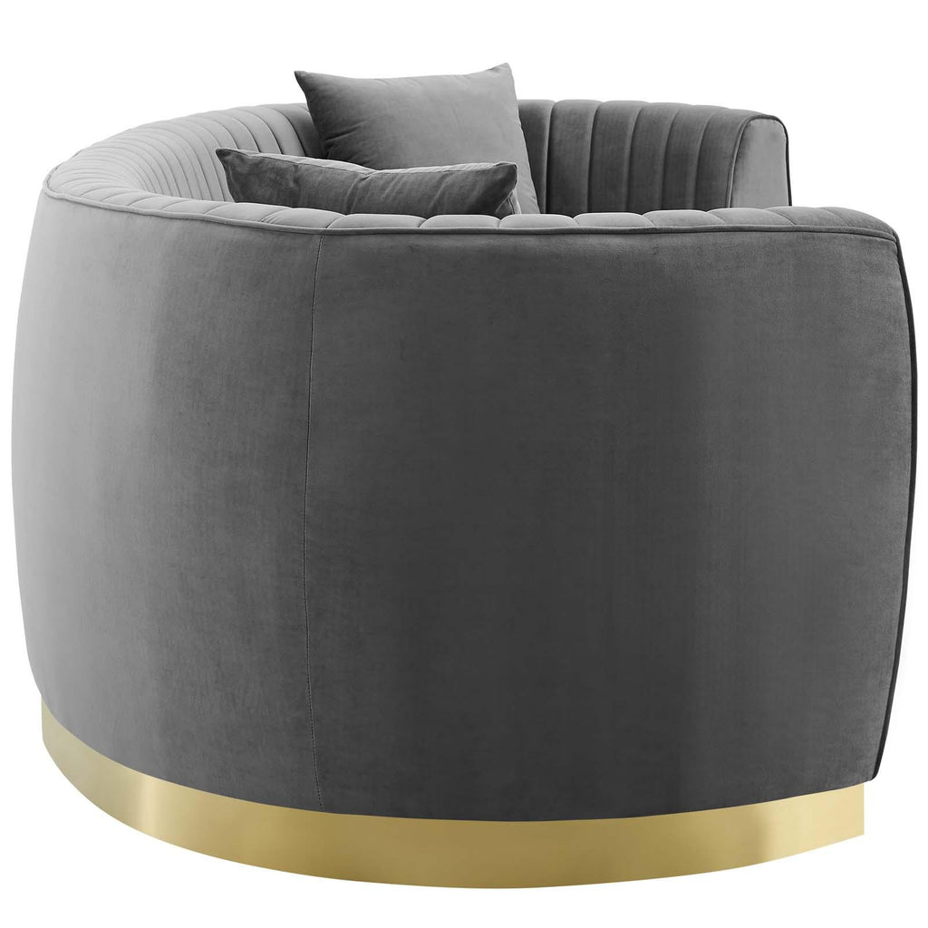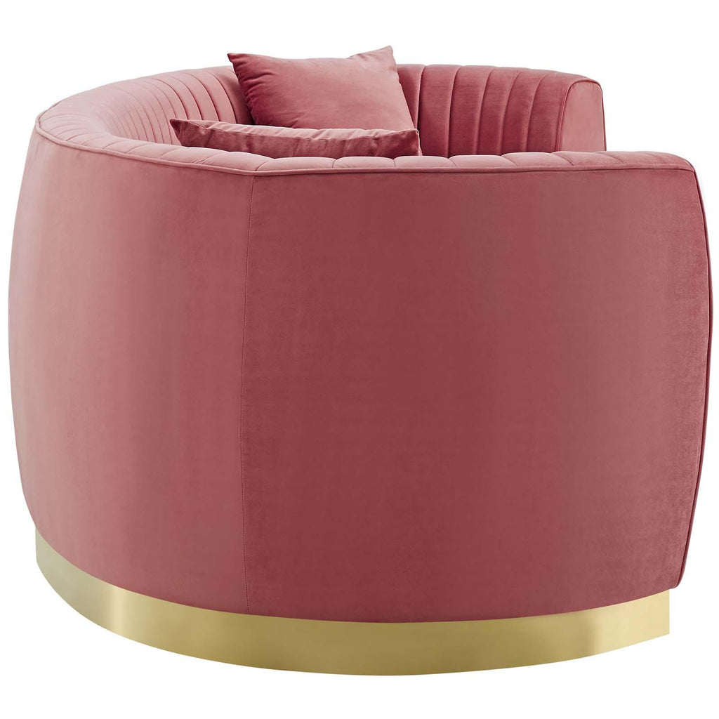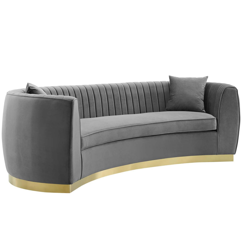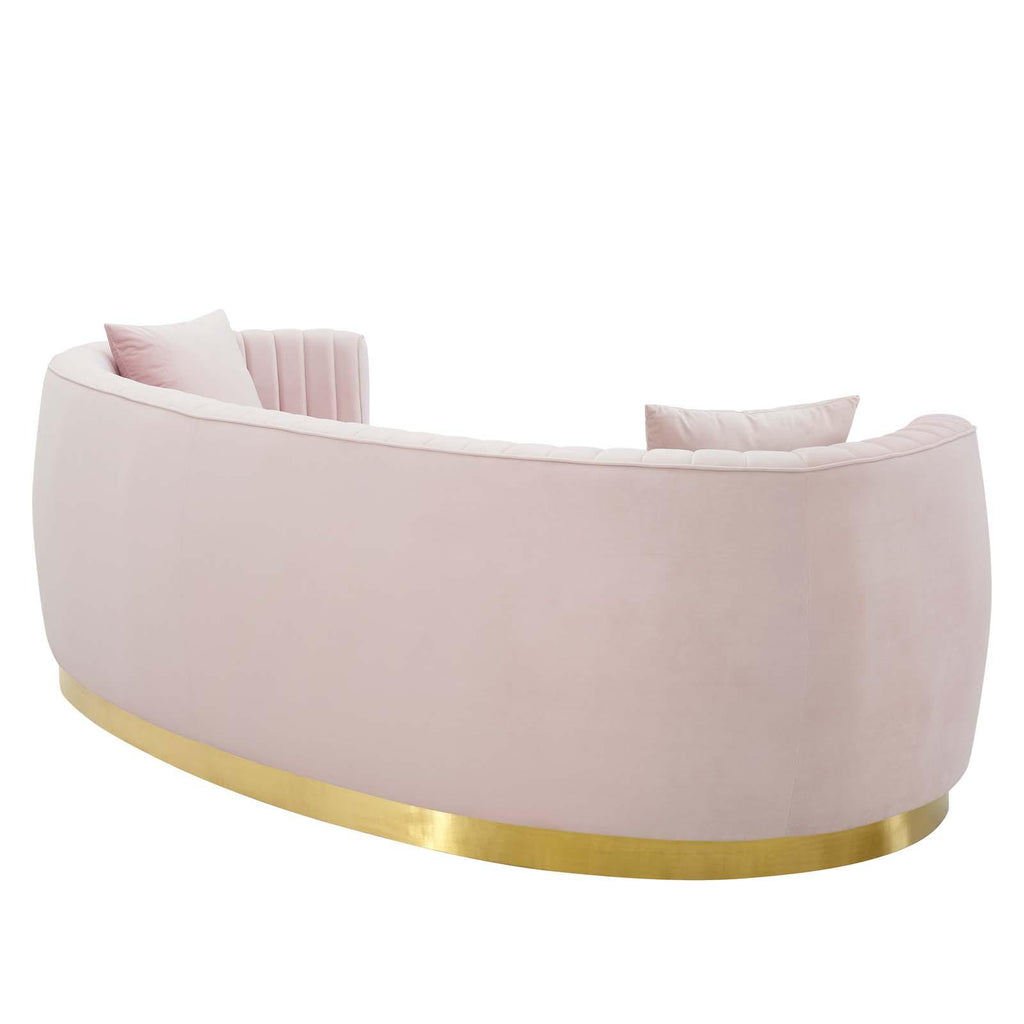 Vintage glamour reclaims the spotlight with the Enthusiastic Curved Sofa. The vertical channel tufting and sweeping grace of Enthusiastic gold stainless steel base magnify the unique curved shape of this retro modern sofa that will be the focal point of your living room, lounge room, home office, and other seating areas. Luxuriously soft, stain-resistant performance velvet upholstery draw lingering conversation and relaxation to your home. Enthusiastic features dense foam padding, a removable seat cushion with a removable cover, and individually wrapped coil spring system for an elegant piece that is irresistibly comfortable and supportive. This chic sofa comes complete with two accent pillows that perfectly complement Enthusiastic's rich hue. Maximum Weight Capacity: 900 lbs. Comes Fully Assembled.