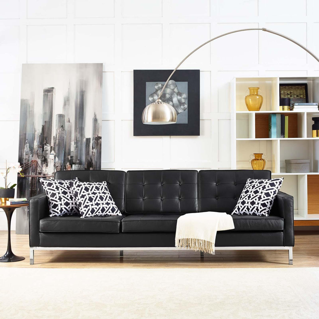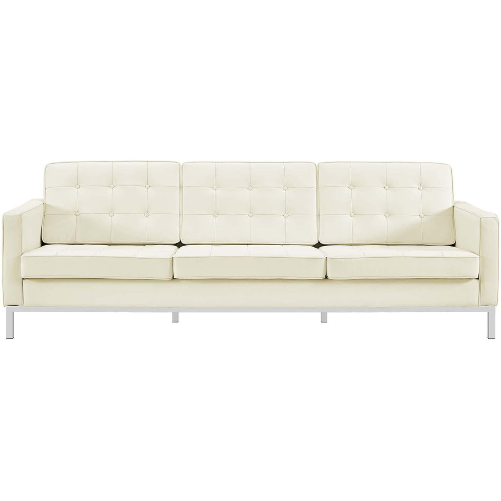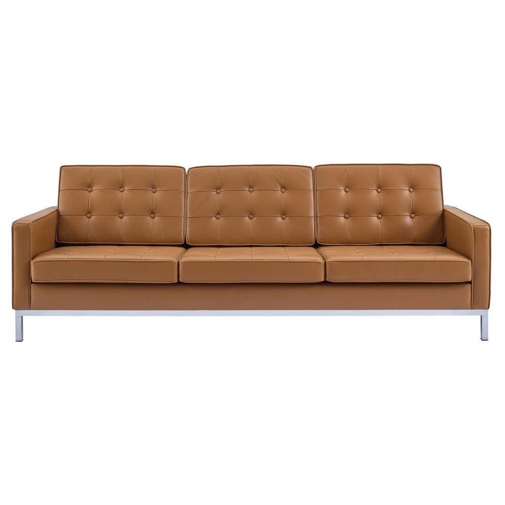 The mid-20th century was a time when hopes were at their highest. Technological developments were bustling forward, and the new world was just barely visible in the distance. But this time also presented a dilemma of sorts. The test of this forthcoming era was to be whether industry would foster comfort or stifle it. What makes the Loft series so complete? At first glance, it displays a pleasant linear design with an external tubular stainless steel frame. The back and seat are tufted and buttoned to enhance the overall richness of the piece. But can these aspects be said to define the totality of a classic? The answer then must be something profound. A thought that serves as representative of that era, while matching the sentiments of our present age. Our suggestion is that the Loft series conveys the potential of progress. From amidst the steel base, a comfortable seating experience is attained. From out of the exponential surge of technological growth, comes peace and solace. Perhaps this is why Loft is the sofa series of choice for so many Fortune 500 companies. Aside from its iconic feel, the set is symbolic of a time when technological innovation could do no wrong. When �faster� was seen only as something positive. The Loft series is the preferred choice for reception areas, living rooms, hotels, resorts, restaurants, and other lounge spaces. Set Includes: One - Loft Sofa Mid-Century Modern Sofa Top Grain Genuine Leather Tufted Seat and Back with Buttons Stainless Steel Frame Generously padded foam cushions Foot caps to prevent scratching Overall Product Dimensions: 30.5"L x 91"W x 30.5"H Seat Dimensions: 83.5"W x 16"H Armrest Dimensions: 4"W x 23"H Backrest Height: 14.5"H Cushion Thickness: 4"H Armrest Height from Seat: 7"H