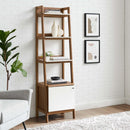 Stack your favorite reads and display home accessories with the Bixby 21" Bookshelf. Featuring a slim tiered silhouette, this bookcase blends organic wood grain with sleek white shelves to create beautiful contrast. With plenty of room for storage and display, this bookshelf is complete with three spacious shelves and a concealed storage area on the bottom to keep living room, home office, or bedroom essentials out of sight. This display stand is crafted with particleboard and MDF for a sturdy construction that's built to last.