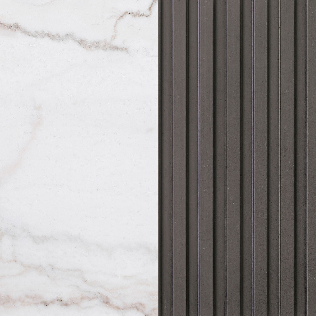This round end table is the perfect complement to any living room setup. Its genuine white marble top, with delicate veining, brings an element of sophistication to your space. The engineered wood frame in a charcoal finish features ribbed detailing that adds texture and depth, while the brushed gold metal base ensures a luxurious foundation. This versatile side table seamlessly combines modern materials and a stylish design to elevate your home. Key Features: • Round end table with genuine white marble top and engineered wood frame • Ribbed design in charcoal finish adds texture and visual depth • Brushed gold metal base provides durability and elegance • White marble top with organic veining offers a sophisticated touch • Engineered wood frame ensures lasting stability and performance • Compact and versatile design ideal for any living room or lounge area