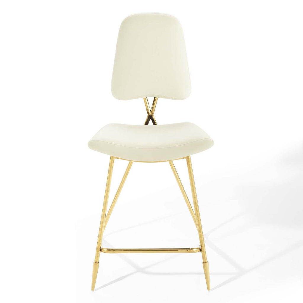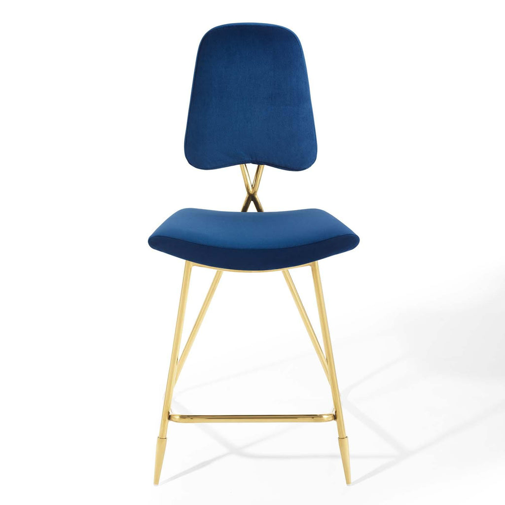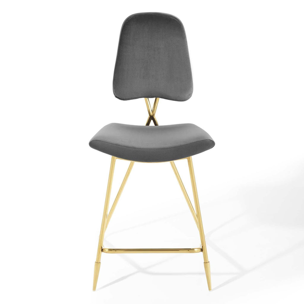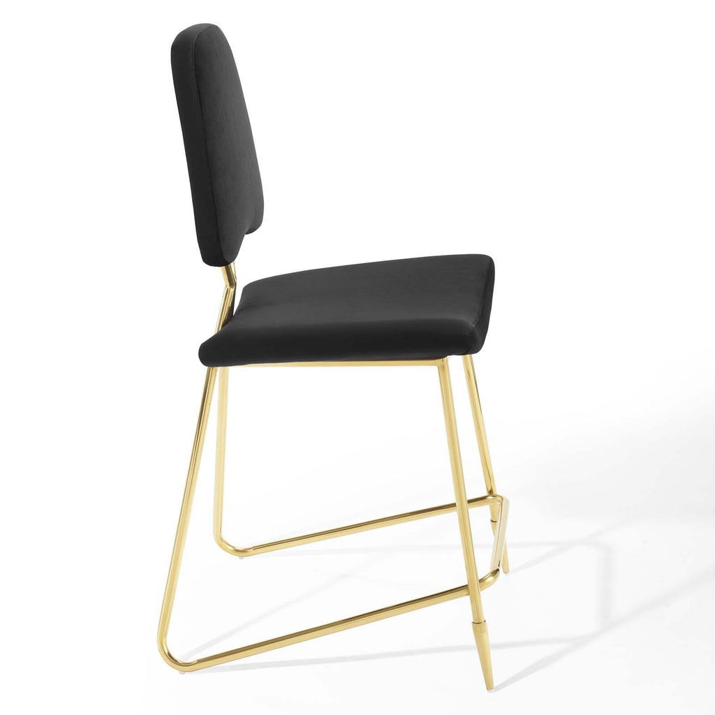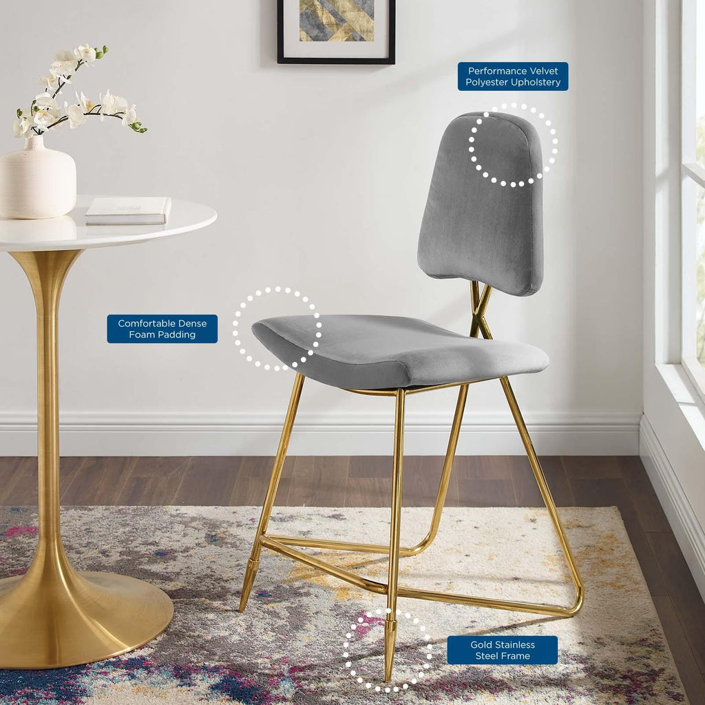 Survey your surroundings with confidence with the Ponder Upholstered Performance Velvet Dining Room Counter Stool. Ponder�s padded high-density foam seat gently slopes upward providing embracing comfort while the tapered back provides ergonomic support. Finely upholstered in stain-resistant performance velvet polyester, the Ponder Dining Stool makes a striking statement with its gold stainless steel base featuring two angled front sleek legs and a rear tripod base. Accentuate your modern decor with a contemporary dining room or counter stool that elevates any empty area of your home. Counter Stool Weight Capacity: 330 lbs.