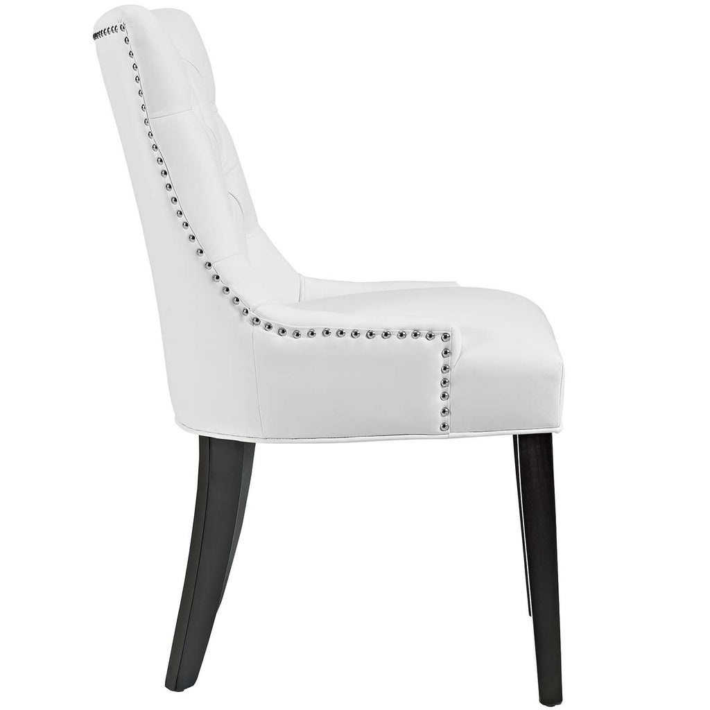Transport your dining room d�cor to a simpler time with the Regent Tufted Button Upholstered Faux Leather Parsons Dining Chair. With a chic and elegant look, the Regent Accent Chair features finely tufted buttons and studded nailhead trim that enhance any dining room, living room, lounge room, or office decor with timeless elegance. The Regent Dining Chair has a seat generously padded with foam and a spring coil system with webbing for long-lasting comfort. Covered in durable faux leather upholstery, the Regent Dining Room Side Chair comes with non-marking foot caps, black stained tapered wood legs, and is a masterful choice for modern and traditional dining and living rooms. Chair Weight Capacity: 285 lbs. Assembly Required. Set Includes: One - Regent Dining Chair Nailhead Trim Details Tufted Button Accents Faux Leather Upholstery Black Stained Tapered Wood Legs Spring Coil System Dense Foam Padding Chair Weight Capacity: 285 lbs. Overall Product Dimensions: 25"L x 22"W x 36"H Seat Dimensions: 18.5"L x 21"W x 20.5"H Armrest Width: .5"W Backrest Thickness: .5"W