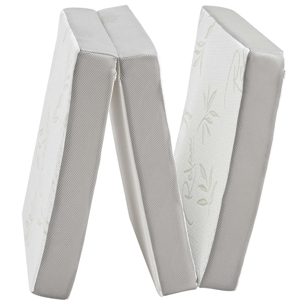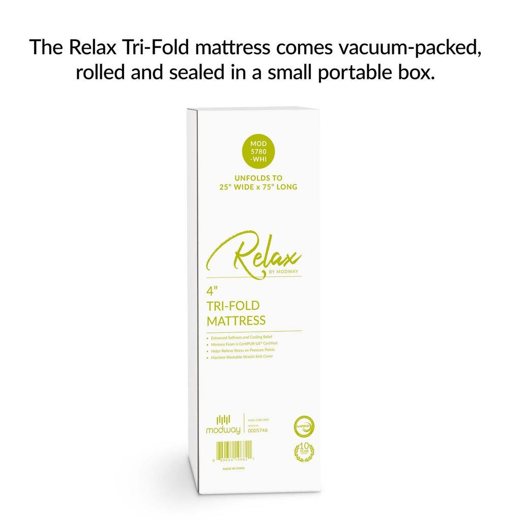 Enjoy reliable comfort with the Modway Relax 4� Tri-Fold Mattress. Complete with a .5� top layer of memory foam, 3.5� of responsive foam, and an ultra-soft removable cover with a non-slip bottom, Relax delivers sound sleep by night and a seating area by day. Unfold Relax in the living room as a play mattress, prop up against the wall to use as an extra lounge chair, or take with your as a portable mattress while camping or traveling. Relax is CertiPUR-US� certified by accredited independent testing laboratories, so you can be confident that the memory foam is made without formaldehyde, ozone depleters, mercury, and other heavy metals including PBDEs, TDCPP or TCEP (�Tris�) flame retardants, and is low on VOC. The Relax folding mattress comes vacuum-packed and rolled to fit into an easily portable box. It takes 2 to 4 hours for Relax to expand most of the way and a day to expand fully. Relax is a firm tri-fold mattress that delivers comfortable support while accommodating the needs of guests, dorm room friends, and family fun activities.
