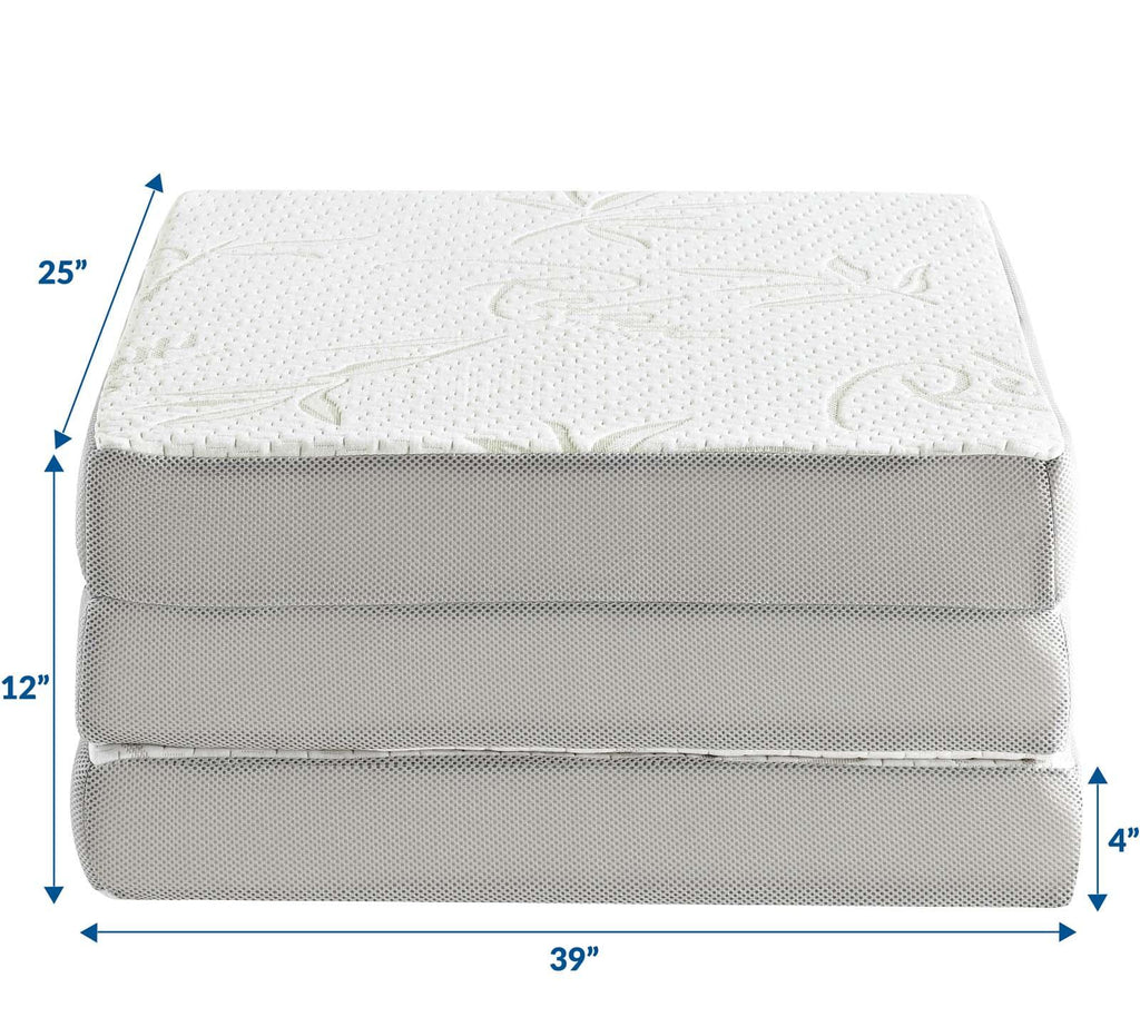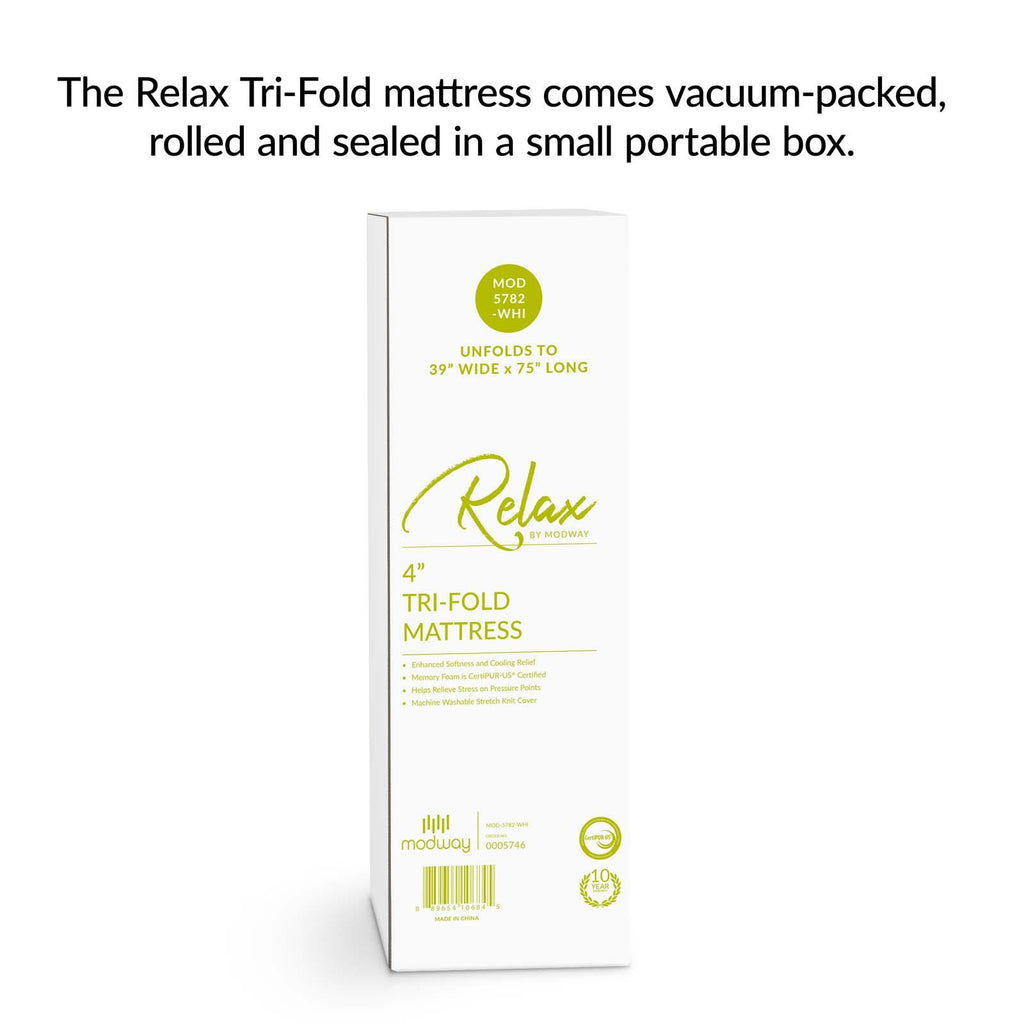 Enjoy reliable comfort with the Modway Relax 4� Twin Tri-Fold Mattress Topper. Complete with a .5� top layer of memory foam, 3.5� of responsive foam, and an ultra-soft removable cover with a non-slip bottom, Relax delivers sound sleep by night and a seating area by day. Unfold Relax in the living room as a play mattress, prop up against the wall to use as an extra lounge chair, or take with your as a portable mattress while camping or traveling. Relax is CertiPUR-US� certified by accredited independent testing laboratories, so you can be confident that the memory foam is made without formaldehyde, ozone depleters, mercury, and other heavy metals including PBDEs, TDCPP or TCEP (�Tris�) flame retardants, and is low on VOC. The Relax Twin folding mattress comes vacuum-packed and rolled to fit into an easily portable box. It takes 2 to 4 hours for Relax to expand most of the way and a day to expand fully. Relax is a firm tri-fold mattress that delivers comfortable support while accommodating the needs of guests, dorm room friends, and family fun activities.