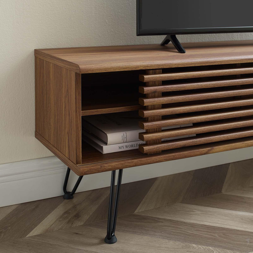 Tap into mid-century aesthetics with the Render 59" TV Stand. This installment of the Render collection features a durable particleboard frame with smooth walnut grain laminate, four metal hairpin legs, full-extension center drawer with shelf on top, and opposite side adjustable shelves with dual slatted sliding doors for sophisticated media storage. This versatile mid-century modern living room table features a solid construction with a pleasing look and practical functionality. Perfect for media storage, Render accommodates flat-screen TVs up to 64" wide.