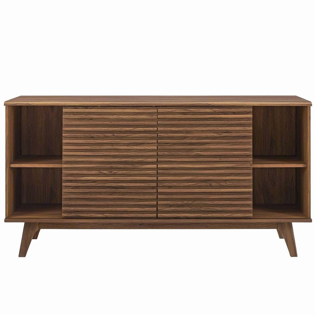 Tap into mid-century aesthetics with the Render Sideboard Buffet Display Stand. This dining room buffet table features a durable particleboard frame with smooth walnut grain laminate, four tapered wood legs, an adjustable shelf on both sides, three center full-extension glide drawers, and two sliding doors for easy access to shelf storage. Render features an abundance of storage for your silverware, dishes, and other dining room finery. Boasting a mid-century modern style this accent table features a solid construction with a pleasing look and practical functionality. Perfect as a sideboard, credenza, storing and serving buffet table, and display stand, Transmit also accommodates flat-screen TVs up to 70� wide as a living room or lounge area TV stand.