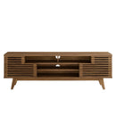 Tap into mid-century aesthetics with the Render 71" Media Console TV Stand. This installment of the Render Collection features a durable particleboard and MDF frame with smooth wood grain laminate, four tapered legs, two center cable management holes, and two adjustable sliding slatted doors for both display and concealed shelf storage. This versatile mid-century modern living room entertainment center features a solid construction with a pleasing look and practical functionality. Perfect for media storage, this entertainment console accommodates flat-screen TVs up to 78�. Assembly required.