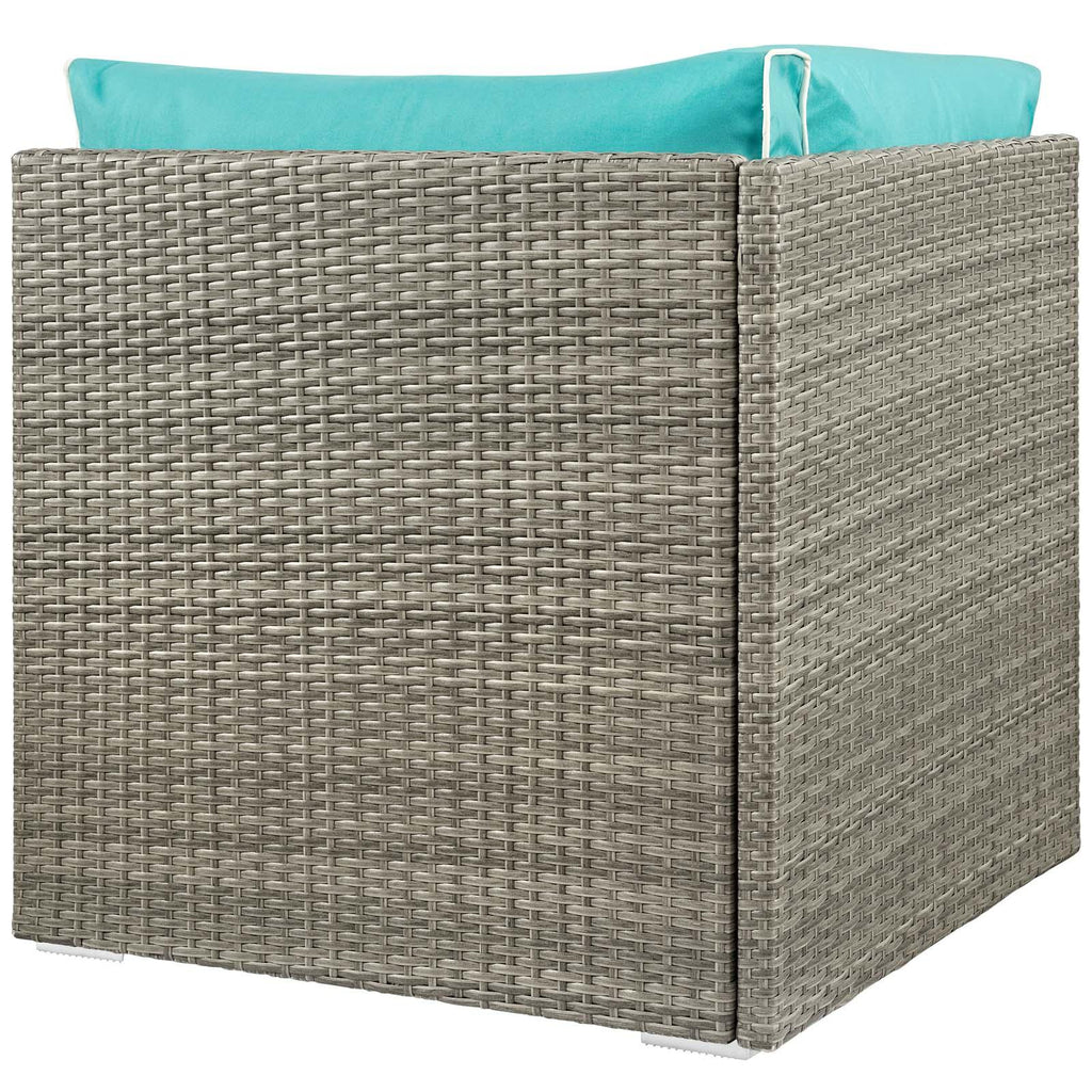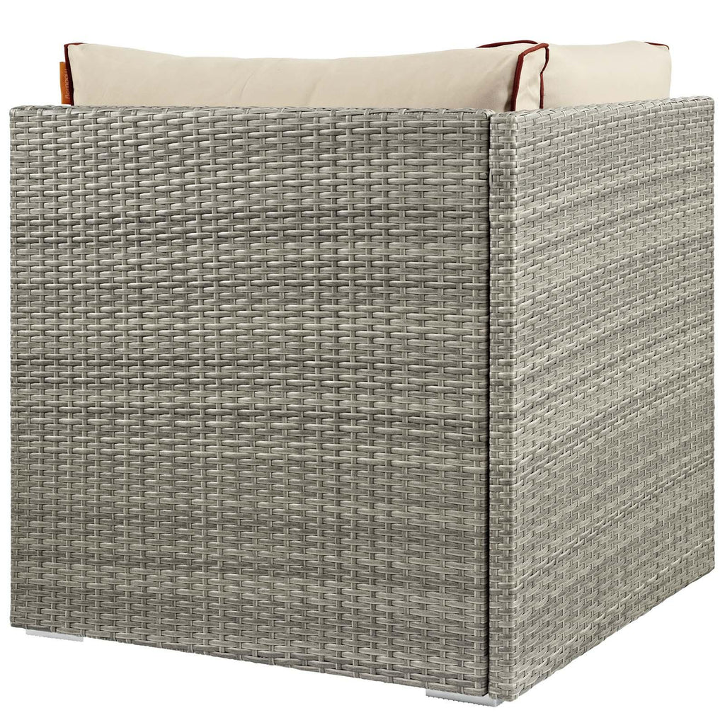 Enjoy the outdoors while benefiting from style and comfort of the Repose Outdoor Patio Furniture Series. Repose Patio Corner Sofa Chair offers a detailed tan and gray synthetic rattan weave with UV protection for eye-catching appeal and durability, plush 4� thick all-weather polyester cushions with contrasting color French piping, non-marking foot pads, and a sturdy powder-coated aluminum frame that supports up to 331 pounds. Subtle style defines the Repose outdoor sectional collection making it a natural choice for enhancing your patio, backyard, or poolside gatherings. This installment of the series is a patio corner sofa chair. Set Includes: One - Repose Corner Outdoor Patio Corner Tan/Gray Synthetic PE Rattan Powder Coated Aluminum Frame Machine Washable Cushion Covers Water and UV Resistant Non-Marking Foot Pads Assembly Required Overall Product Dimensions: 30"L x 30"W x 34"H Cushion Dimensions: 28.5"L x 28.5"W x 4"H Floor to Top of Seat: 17.5"H