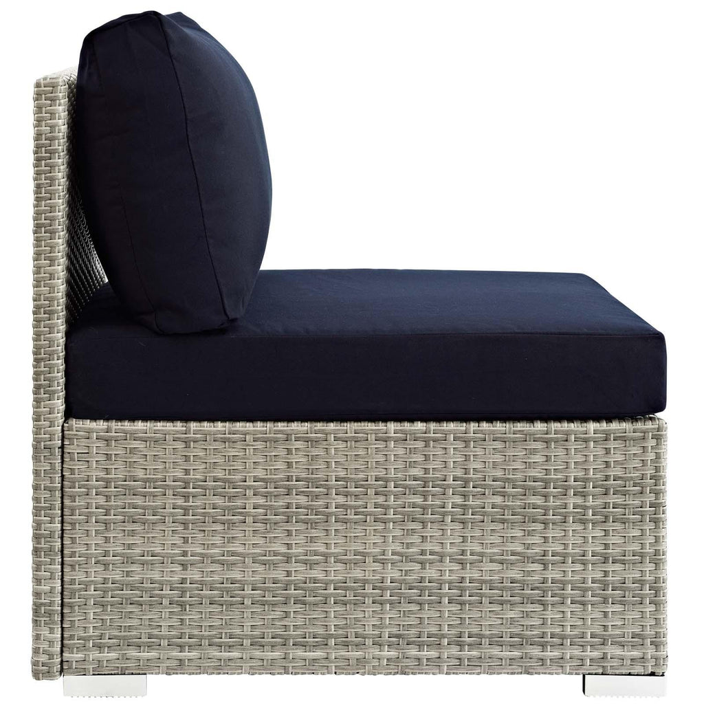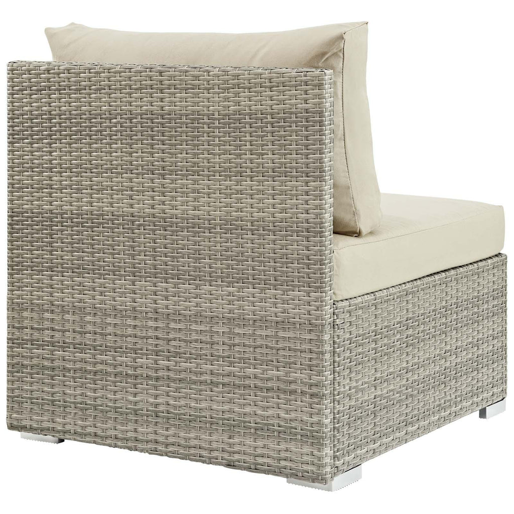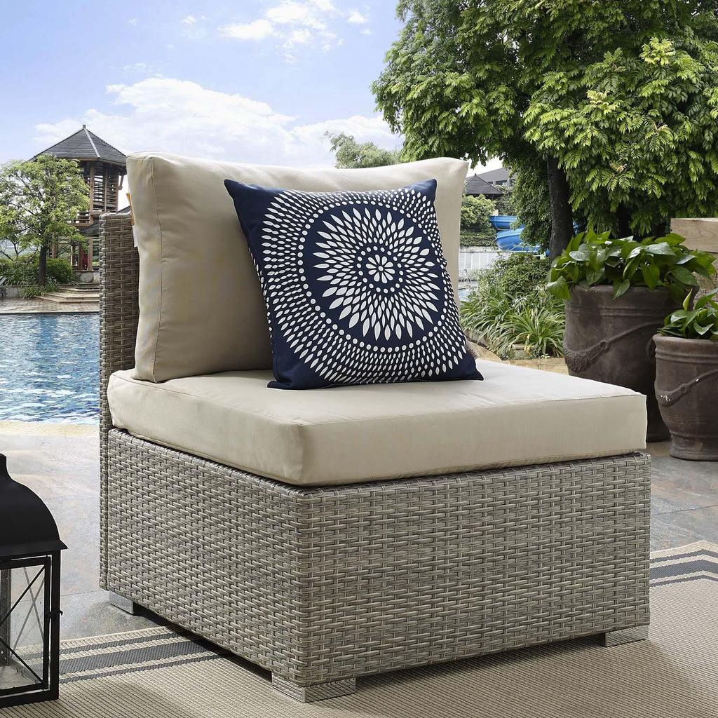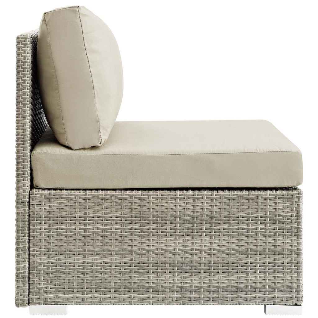 Enjoy the outdoors while benefiting from style and comfort of the Repose Outdoor Patio Furniture Series. Repose Patio Armless Sectional Sofa Chair offers a detailed tan and gray synthetic rattan weave with UV protection for eye-catching appeal and durability, plush 4� thick all-weather polyester cushions using industry-leading Sunbrella� fabric, non-marking foot pads, and a sturdy powder-coated aluminum frame that supports up to 331 pounds. Subtle style defines the Repose outdoor sectional collection making it a natural choice for enhancing your patio, backyard, or poolside gatherings. This installment of the series is an outdoor patio armless chair. Set Includes: One - Repose Sunbrella� Fabric Armless Chair Tan/Gray Synthetic PE Rattan Powder Coated Aluminum Frame Sunbrella� Fabric Made Of Polyester Machine Washable Cushion Covers Water and UV Resistant Non-Marking Foot Pads Assembly Required Overall Product Dimensions: 30"L x 28.5"W x 34"H Cushion Dimensions: 28.5"L x 28.5"W x 4"H Floor to Top of Seat: 17.5"H