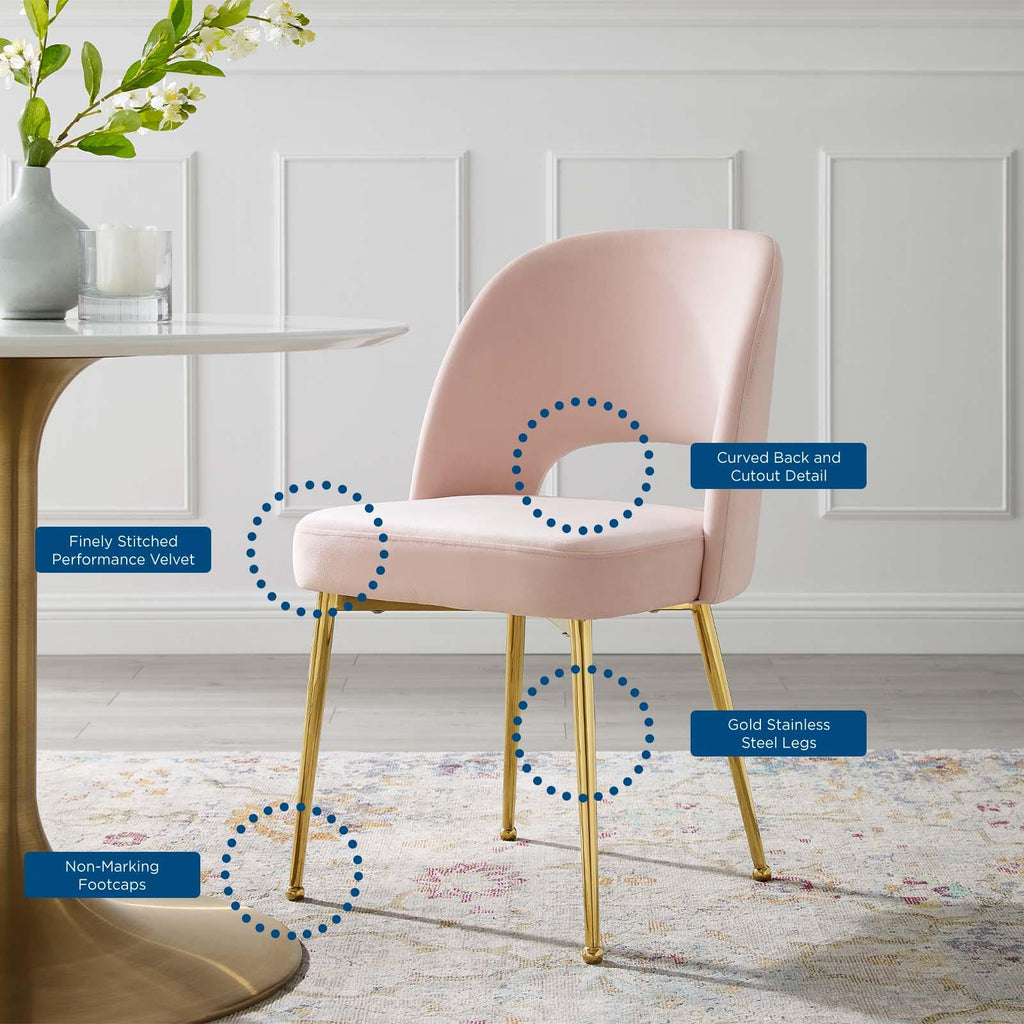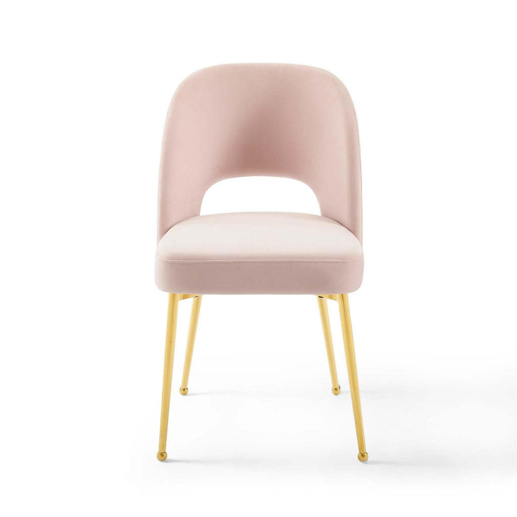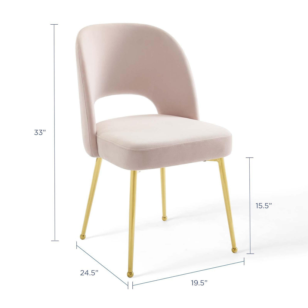 Revel in a stylish update on a classic design. Comprised of densely padded foam that supports the soft, stain-resistant performance velvet upholstery, Rouse offers a luxurious update to mid-century design. This glamorous dining chair is constructed from bentwood and sits atop four gold stainless steel splayed and tapered legs with ball feet. A comfortable velvet dining chair with open back design, experience the smooth curves and subtle embrace of this versatile dining room side chair. Chair Weight Capacity: 331 lbs. Set Includes: One - Rouse Dining Room Side Chair Dining Room Side Chair Performance Velvet Upholstery Gold Stainless Steel Legs Dense Foam Padding Mid-Century Modern Design Splayed and Tapered Legs Chair Weight Capacity: 331 lbs Overall Product Dimensions: 19.5"L x 24.5"W x 33"H Seat Dimensions: 19"L x 19"W x 19.5"H Backrest Dimensions: 19"W x 13.5"H Leg Dimensions: 15.5"H