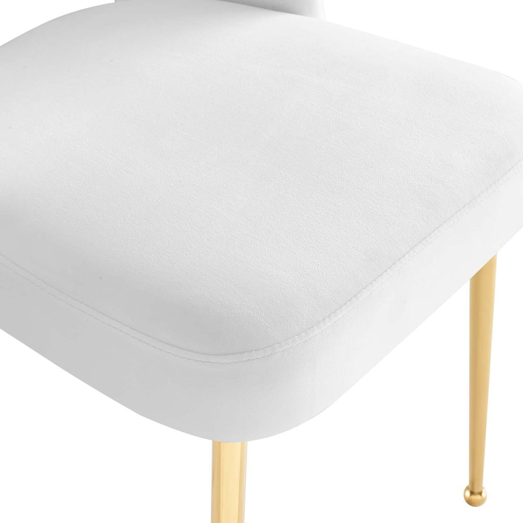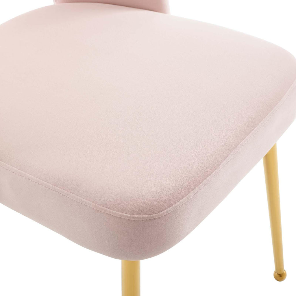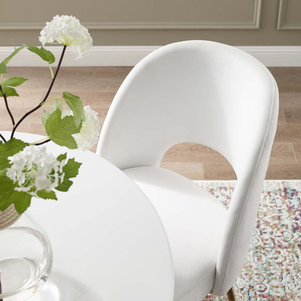 Revel in a stylish update on a classic design. Comprised of densely padded foam that supports the soft, stain-resistant performance velvet upholstery, Rouse offers a luxurious update to mid-century design. This glamorous dining chair is constructed from bentwood and sits atop four gold stainless steel splayed and tapered legs with ball feet. A comfortable velvet dining chair with open back design, experience the smooth curves and subtle embrace of this versatile dining room side chair. Chair Weight Capacity: 331 lbs. Set Includes: One - Rouse Dining Room Side Chair Dining Room Side Chair Performance Velvet Upholstery Gold Stainless Steel Legs Dense Foam Padding Mid-Century Modern Design Splayed and Tapered Legs Chair Weight Capacity: 331 lbs Overall Product Dimensions: 19.5"L x 24.5"W x 33"H Seat Dimensions: 19"L x 19"W x 19.5"H Backrest Dimensions: 19"W x 13.5"H Leg Dimensions: 15.5"H