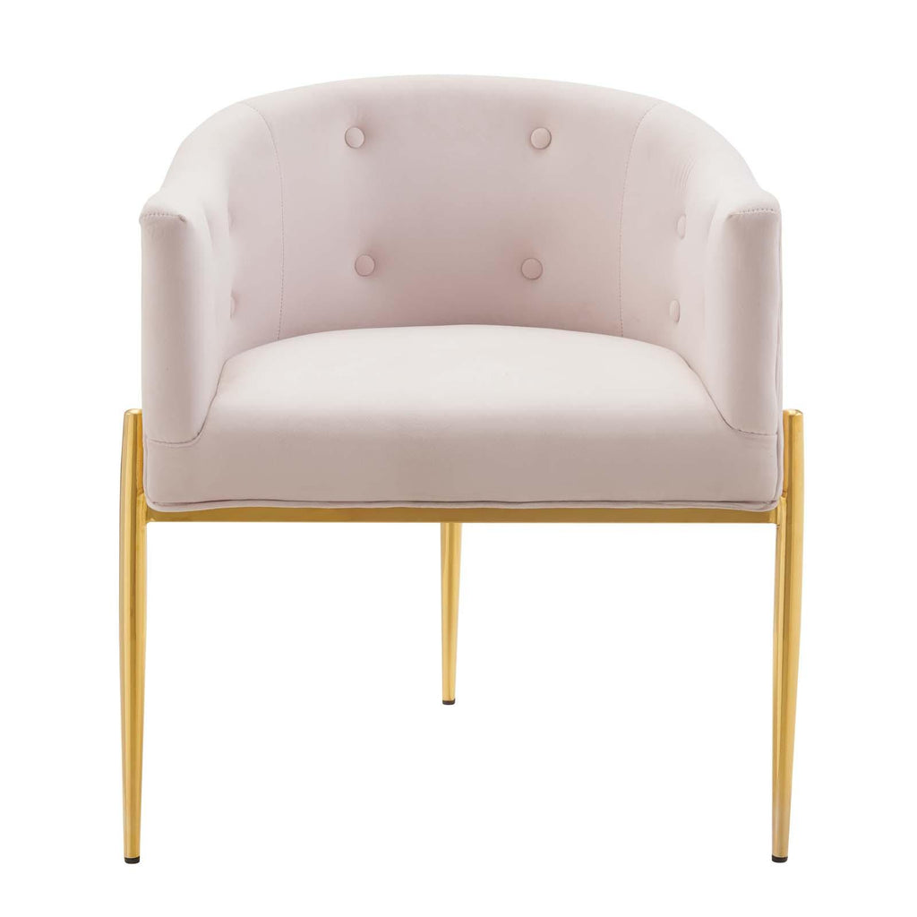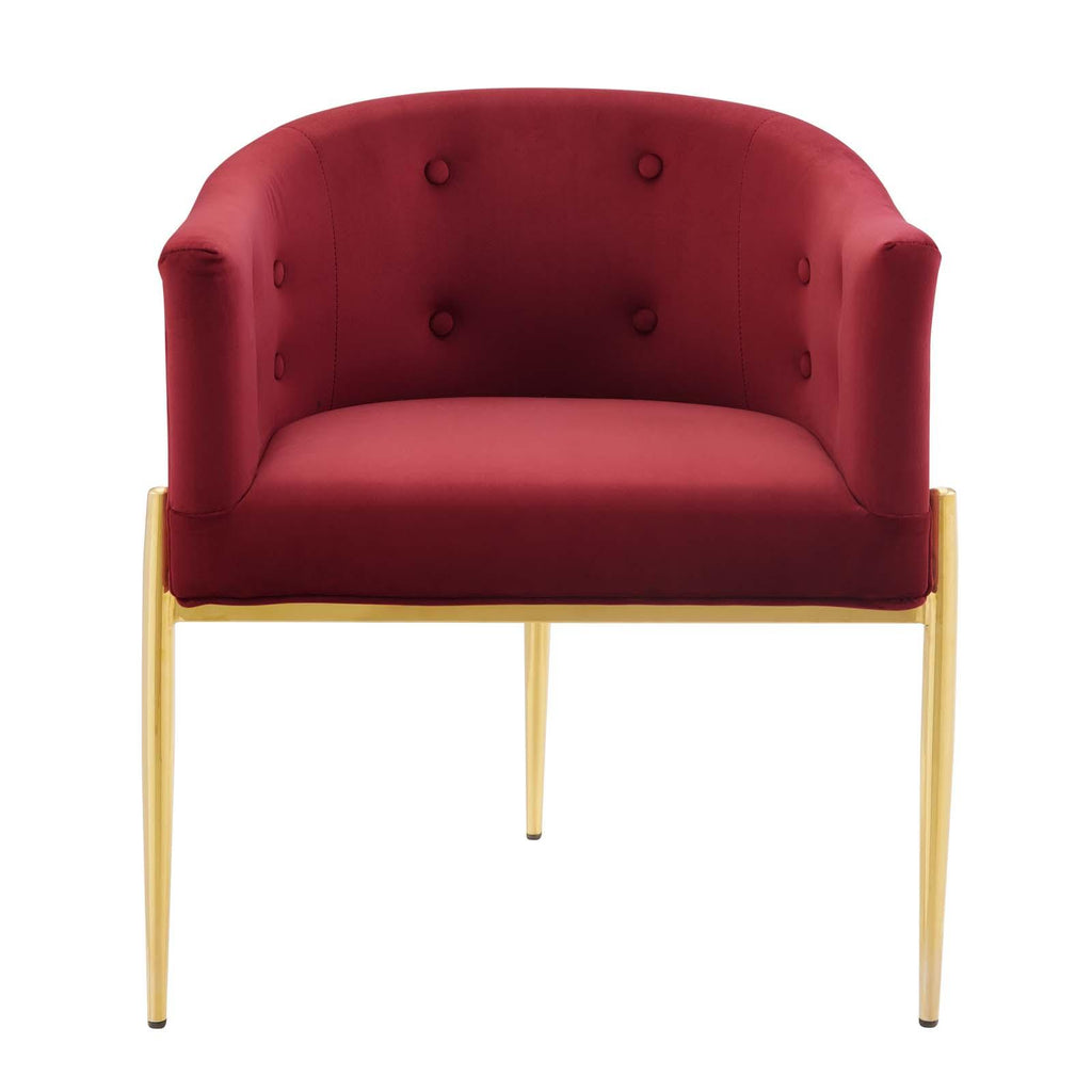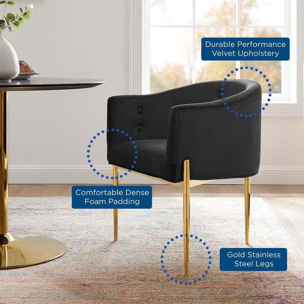 Bring luxe elegance to your living space or dining room with the Savour Tufted Performance Velvet Accent Armchair. Featuring a sweeping silhouette and updated club chair design, this velvet chair is suited for the dining table or living room, entryway, bedroom, or office as an accent chair. This accent chair is upholstered in stain-resistant performance velvet upholstery and features dense foam padding to offer a comfortable seat while dining, working, reading, or relaxing. Resting on chrome gold stainless steel legs, this versatile accent chair has interior button tufting and a charming curved shape. Chair Weight Capacity: 300 lbs.