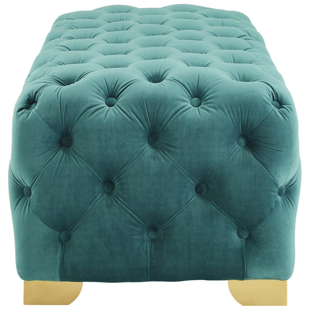 Refresh your entryway, bedroom, or living room decor with the Sensible Accent Bench. Deep button tufting covers the full expanse of Sensible�s soft, stain-resistant performance velvet upholstery. Generous dense foam padding enhances a luxurious seating experience, while four gold stainless steel legs with non-marking foot caps provide reliable support in this glamorous entryway bench perfect for home or apartment. Bench Weight Capacity: 441 lbs. Set Includes: One - Sensible Button Tufted Bench Performance Velvet Polyester Upholstery Durable Stain-Resistant Fabric Elegant Deep Button Tufting Gold Stainless Steel Legs Dense Foam Padding/Fully Assembled Non-Marking Foot Caps Bench Weight Capacity: 441 lbs. Overall Product Dimensions: 21"L x 49"W x 16.5"H Seat Height: 16.5"H