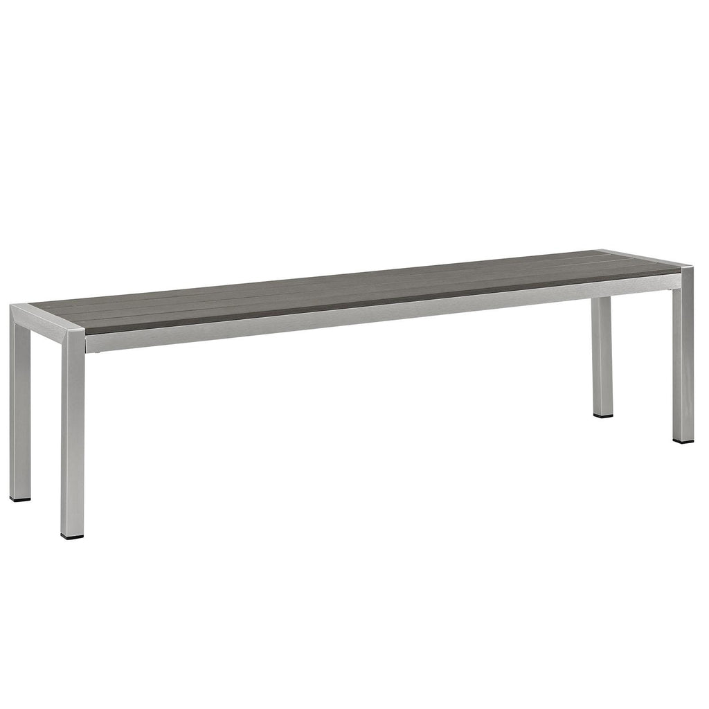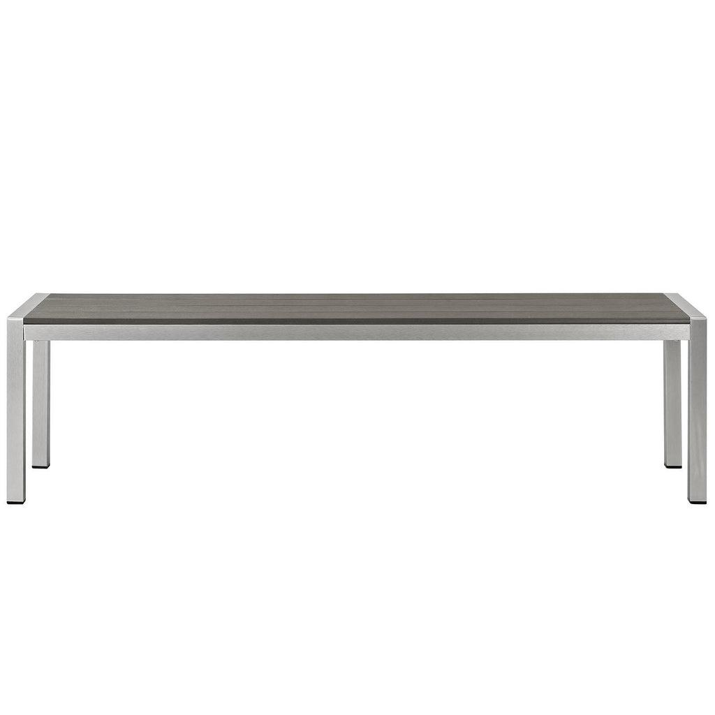 Enjoy your patio or backyard leisure time with the strong and durable Shore Outdoor Patio Bench. Made with an anodized brushed aluminum frame and non-marking black plastic foot caps, Shore Patio Bench features tone-on-tone grays with wood accents on the paneling for a chic and minimalist look. The Shore Outdoor Bench complements your casual gatherings with a look and functionality that you can rely on.