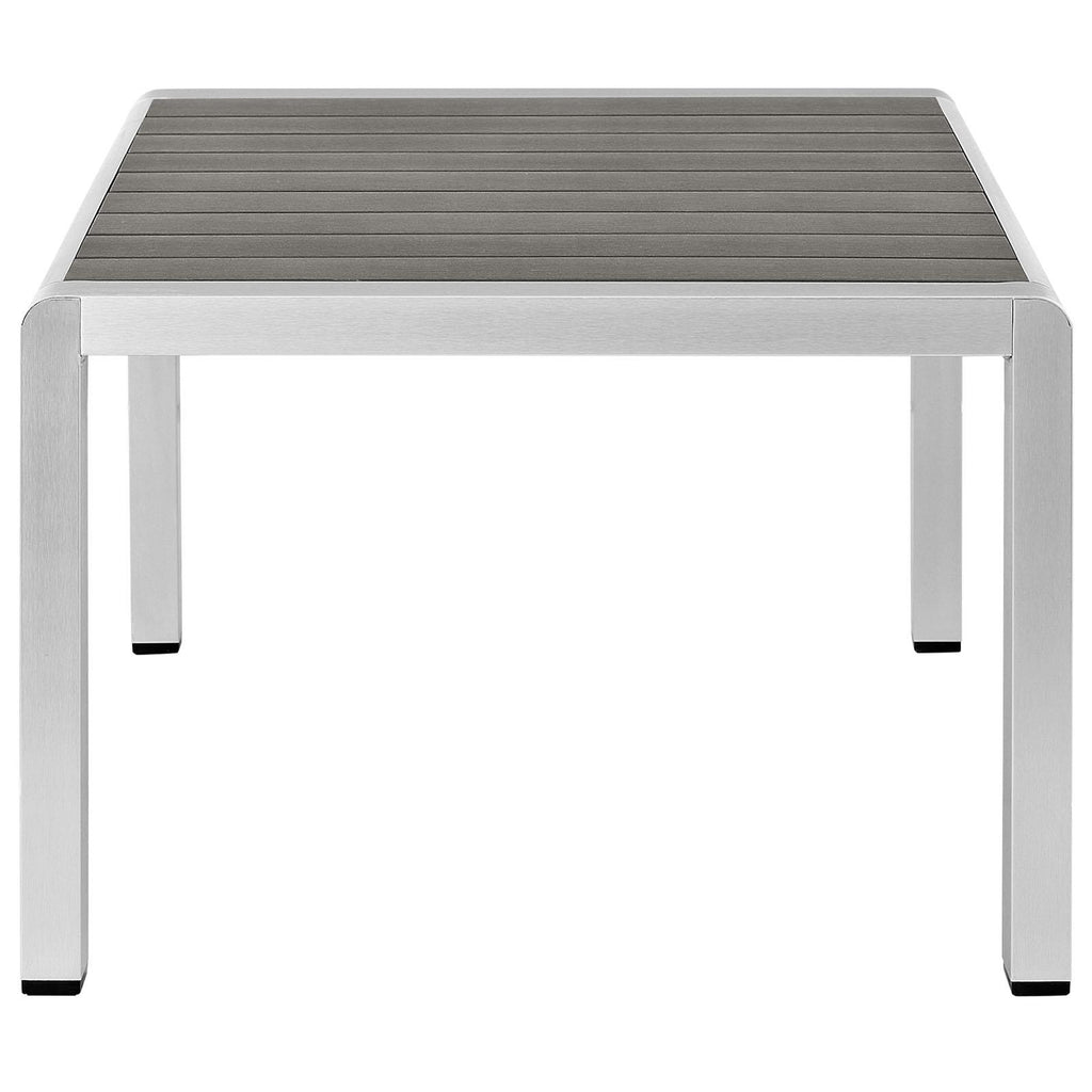 Enjoy your patio or backyard leisure time with the strong and durable Shore Outdoor Aluminum Coffee Table. Made with an anodized brushed aluminum frame and non-marking black plastic foot caps, Shore Patio Coffee Table features tone-on-tone grays with wood accents on the paneling for a chic and minimalist look. The Shore Outdoor Patio Coffee Table complements your casual gatherings with a look and functionality you can rely on.