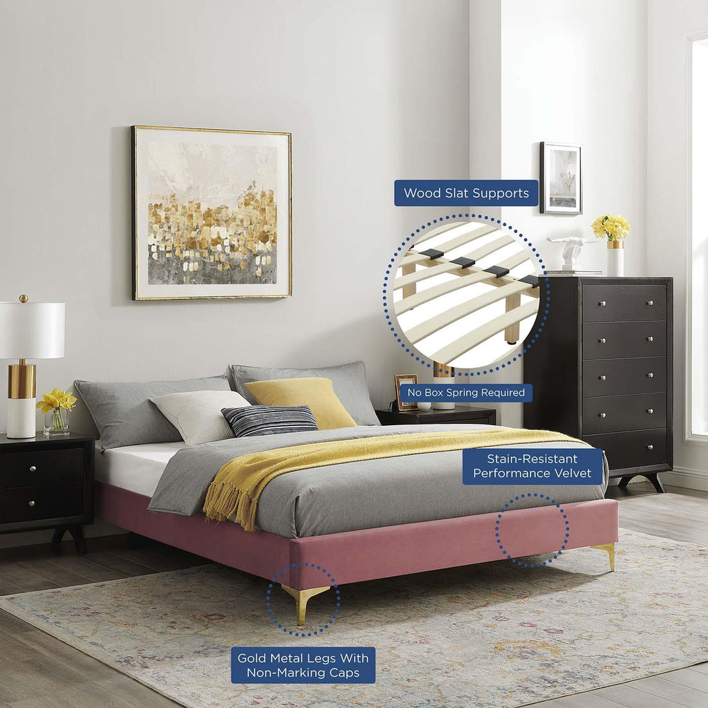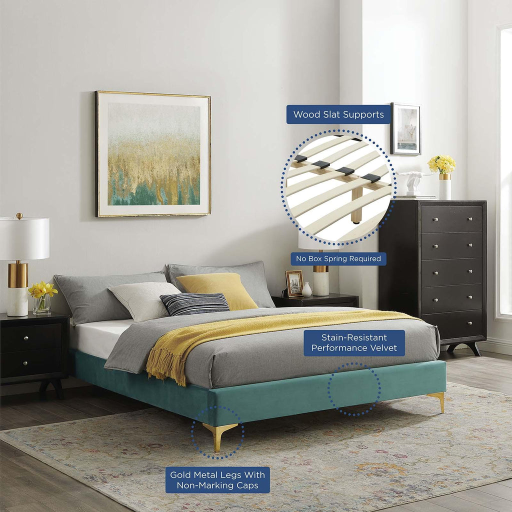 Uplift your master bedroom or guest bedroom decor with the Sutton Performance Velvet Queen Bed Frame. A queen size bed frame covered in stain-resistant performance velvet, this upholstered bed frame is a sturdy mattress foundation for memory foam, innerspring, latex, and hybrid mattresses. Eliminating the need for a box spring, the MDF frame of this queen bed is complete with a wood slat support system crafted with poplar for lasting durability and support. This slatted bed frame rests on gold metal legs with non-marking foot caps and includes a reinforced center beam with two support legs for enhanced stability. The Sutton Bed Frame is compatible with a variety of different headboard styles, or makes a statement as a stand-alone piece in the bedroom. Bed frame interchangeable with Paige, Alyson, Angela, Veronique, Evelyn, Dawn, Cecilia, Lucia, Rosalind, Delilah, Greta, Louisa, Eloise, Daisy, Sadie, Sloane, Fallon, and Lizzy. Mattress not included. Assembly required. Queen Size Bed Frame Weight Capacity: 800 lbs.