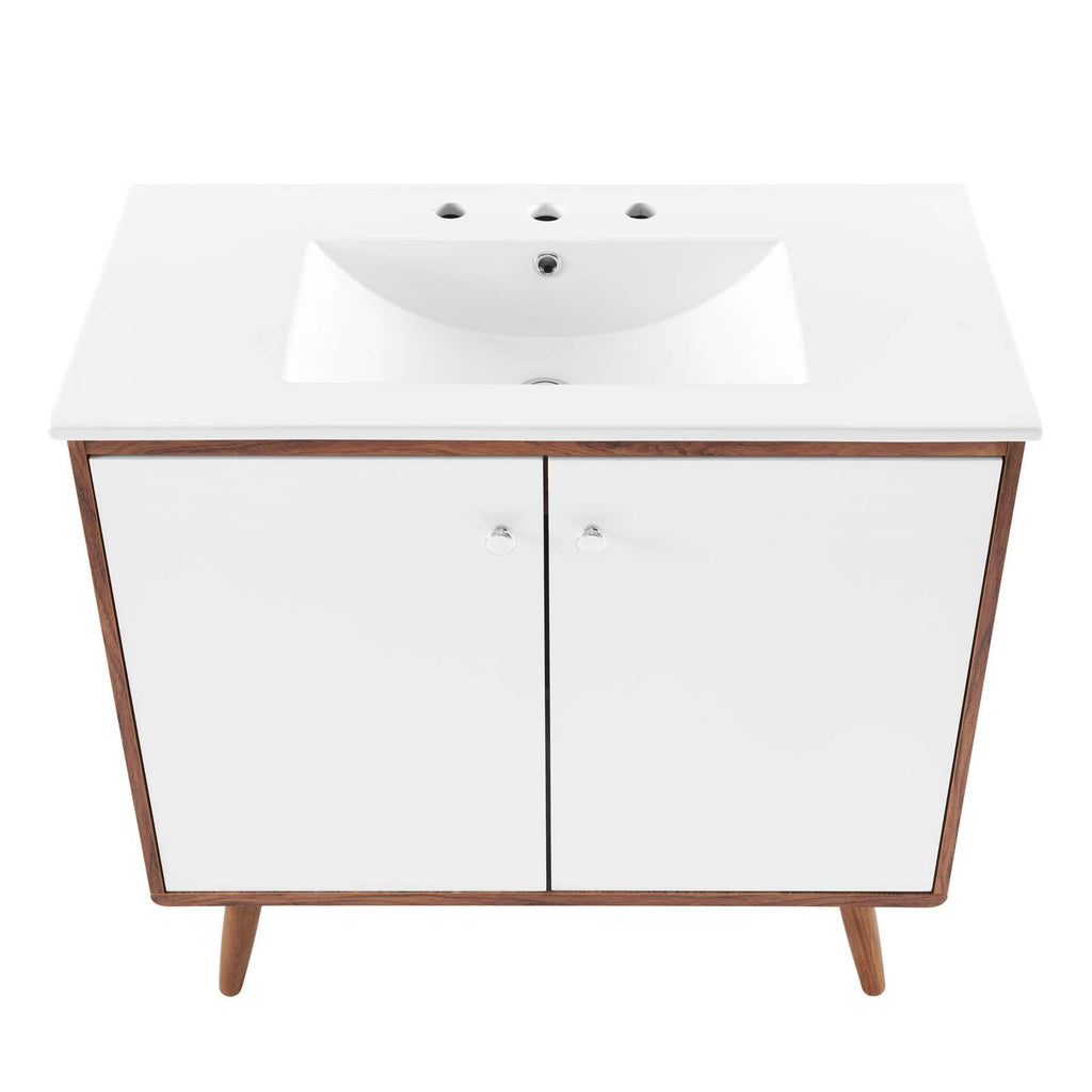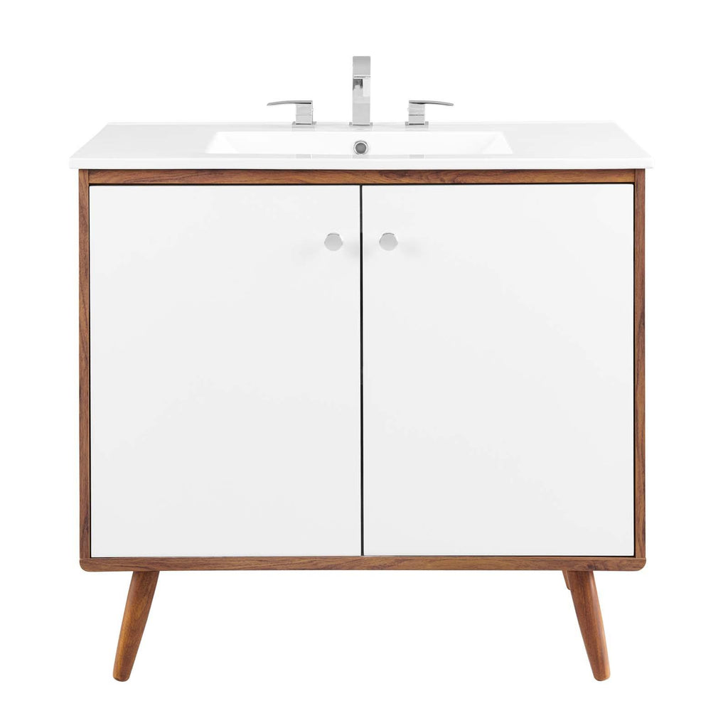 Bring mid-century modern aesthetics into the bathroom with the Transmit 36" Bathroom Vanity. This vanity features a durable particleboard and walnut grain veneer construction with ample storage space for all your bathroom essentials behind two white lacquered soft-close hinged doors. A ceramic sink with an integrated countertop, 8" centerset, and rectangular sink basin continue the sleek look of this retro modern vanity. Complete with chrome knobs, this bathroom vanity rests atop four splayed wood legs. Assembly required and sink fixtures not included. Set Includes: One - Transmit 36" Bathroom Vanity Mid-Century Modern Vanity Splayed Wood Legs Ceramic Sink Basin Particleboard and Walnut Grain Veneer Dual Soft-Close Doors Chrome Hardware Assembly Required Overall Product Dimensions: 18.5"L x 36"W x 33"H