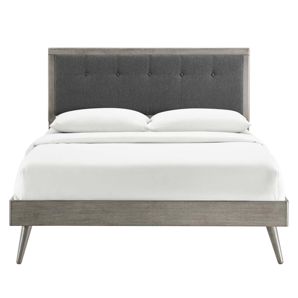 Refresh your master bedroom or guest room with the modern style, retro detail, and organic aesthetics of the Willow Tufted Wood Twin Platform Bed. Inspired by mid-century style, the upholstered headboard of this twin bed frame features a beautiful wood frame that encases a button tufted design. This platform bed frame is a sturdy addition to the bedroom with a durable wood, MDF, and veneer construction and splayed rubberwood legs. Eliminating the need for a box spring, this twin bed is complete with a wood slat support system, reinforced center beam, and supporting legs that make it a lasting mattress foundation for memory foam, latex, innerspring, and hybrid mattresses. Assembly required. Twin Bed Frame Weight Capacity: 601 lbs.