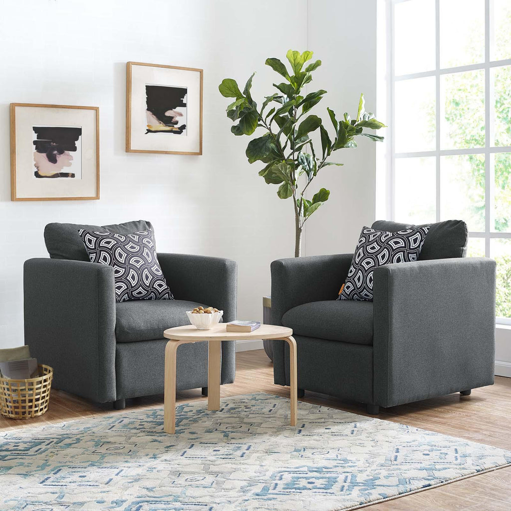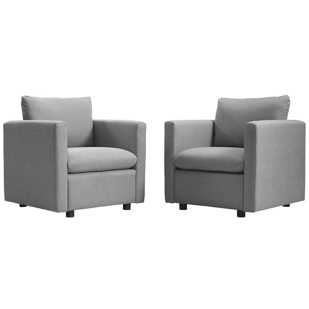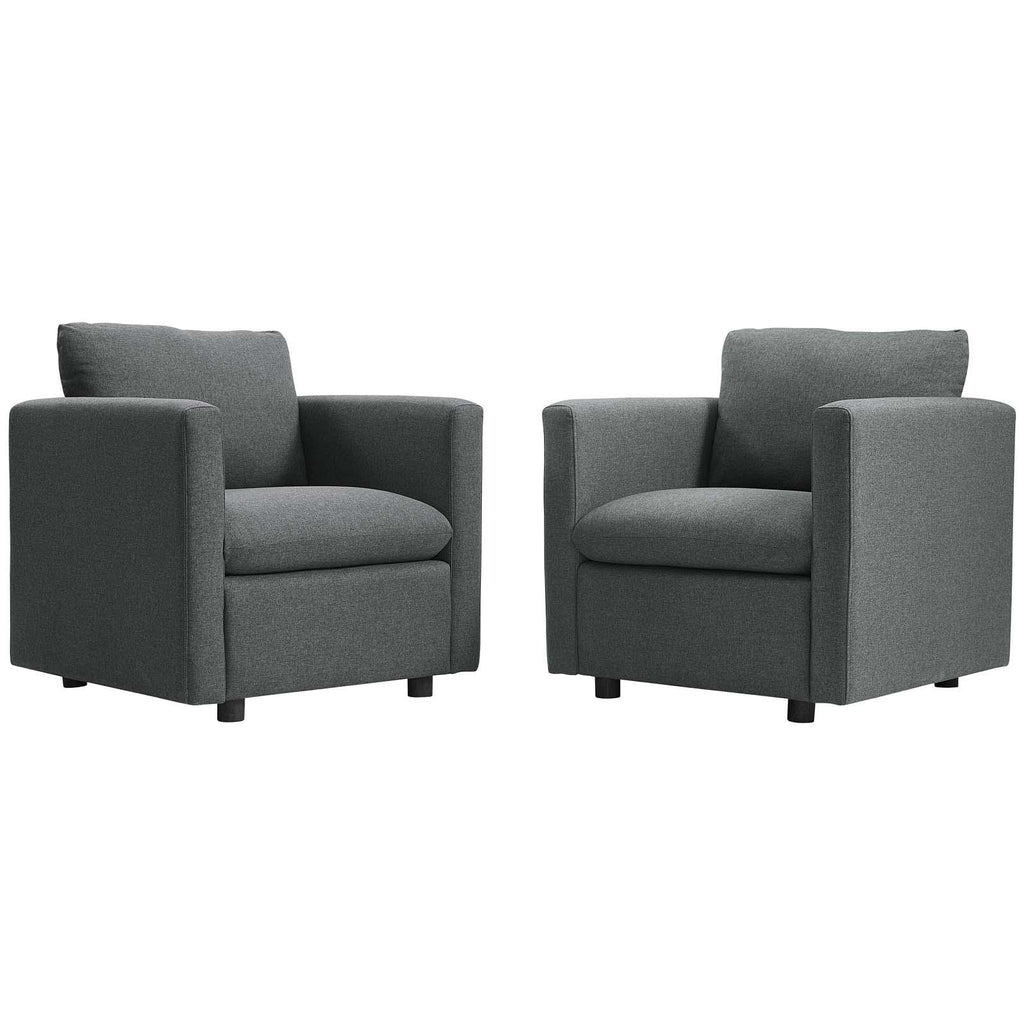 Lounge in style with Activate Armchair Set of 2. A versatile addition to a family room, apartment, office, or small living space, Activate is a cozy modern chair set made with dense foam padding, upholstered in soft polyester fabric, and black wood legs. Say goodbye to the days of hauling heavy furniture. Activate offers modern-day convenience as it ships directly to your home or apartment in a portable, compact box. With a casual yet tailored aesthetic, this living room armchair set easily unpacks to become a favorite lounge spot in your home.