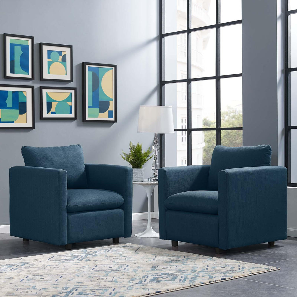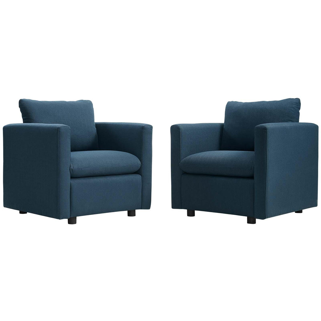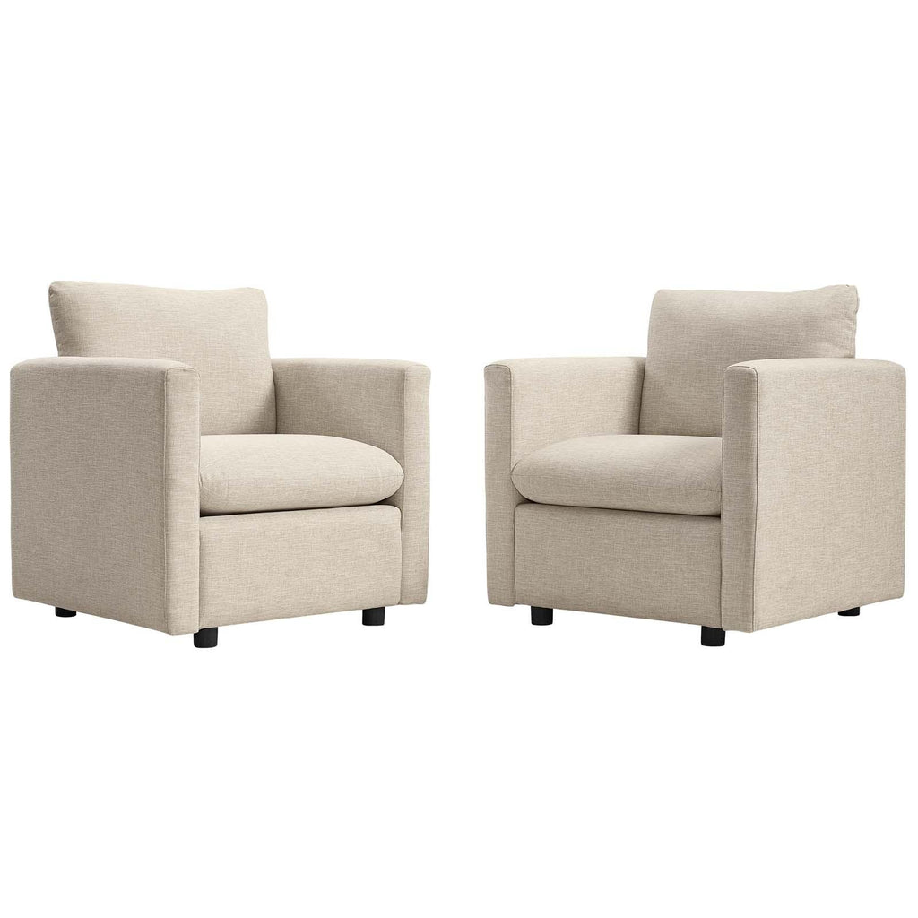 Lounge in style with Activate Armchair Set of 2. A versatile addition to a family room, apartment, office, or small living space, Activate is a cozy modern chair set made with dense foam padding, upholstered in soft polyester fabric, and black wood legs. Say goodbye to the days of hauling heavy furniture. Activate offers modern-day convenience as it ships directly to your home or apartment in a portable, compact box. With a casual yet tailored aesthetic, this living room armchair set easily unpacks to become a favorite lounge spot in your home.