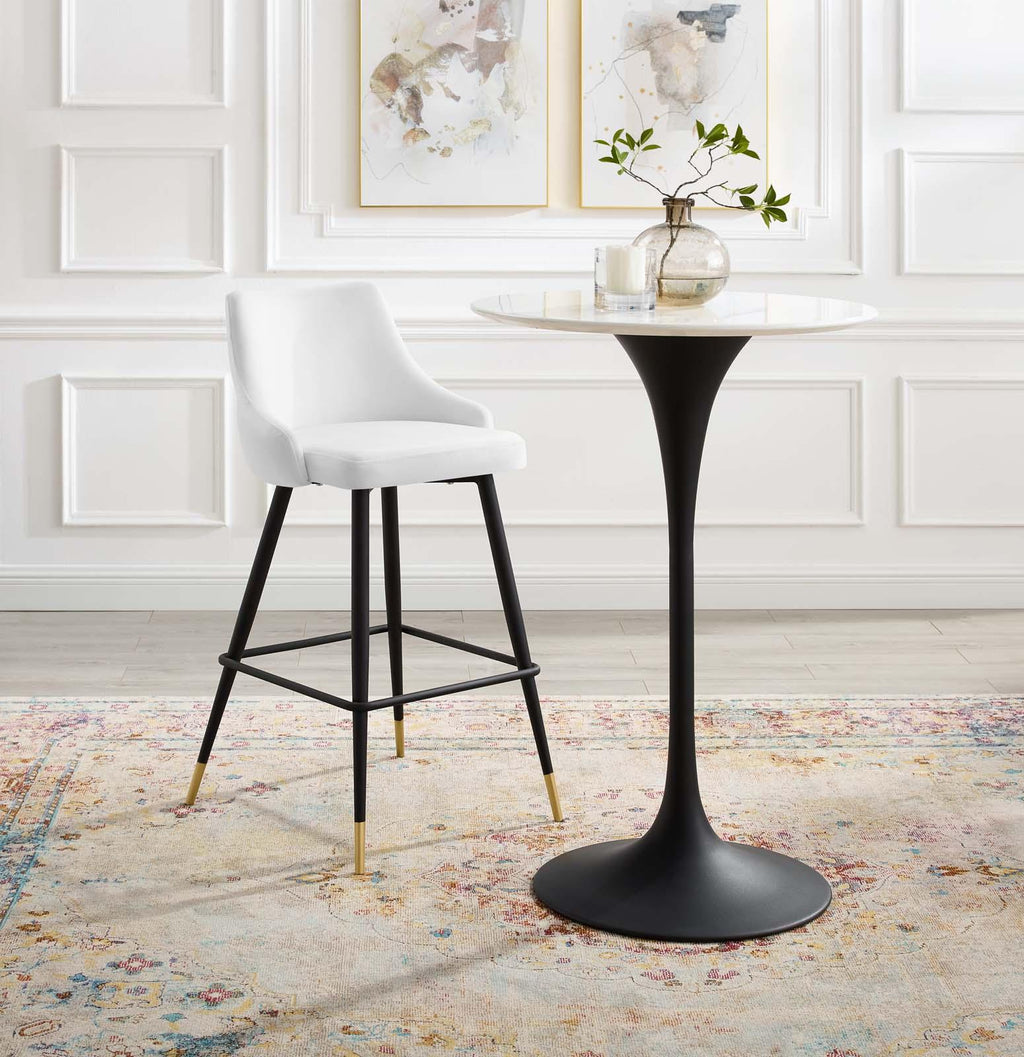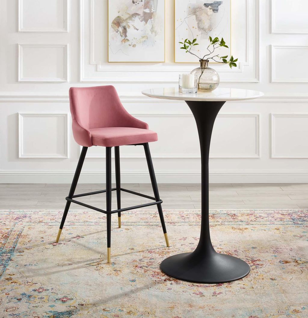 Revitalize dining room or kitchen decor with the Adorn Performance Velvet Bar Stool. Classic button tufting along the stool's exterior and graceful sweeping lines blend seamlessly into the lush comfort of this bar stool. Covered with soft stain-resistant performance velvet, this upholstered bar stool offers a comfortable place to dine with a dense foam padded seat. Sitting on four black tapered legs with gold foot sleeves, Adorn's vintage modern style and glam deco charm makes this bar stool ideally suited for a bar table or kitchen counter, or even as an accompaniment to a standing desk in the home office. This modern dining bar stool supports up to 300 lbs. and is complete with non-marking foot caps to protect your flooring. No assembly required.