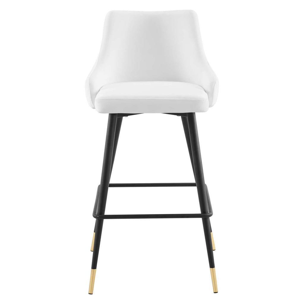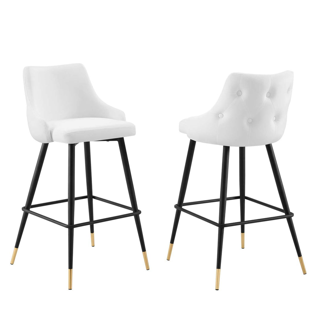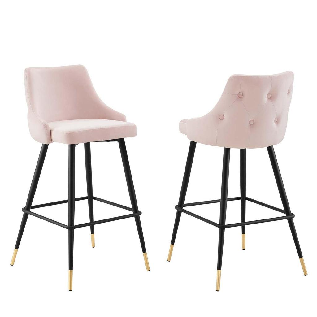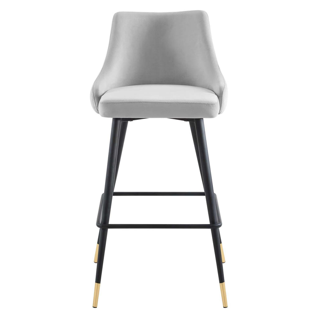 Revitalize dining room or kitchen decor with the Adorn Performance Velvet Bar Stool. Classic button tufting along the stool's exterior and graceful sweeping lines blend seamlessly into the lush comfort of this bar stool. Covered with soft stain-resistant performance velvet, this upholstered bar stool offers a comfortable place to dine with a dense foam padded seat. Sitting on four black tapered legs with gold foot sleeves, Adorn's vintage modern style and glam deco charm makes this bar stool ideally suited for a bar table or kitchen counter, or even as an accompaniment to a standing desk in the home office. This modern dining bar stool supports up to 300 lbs. and is complete with non-marking foot caps to protect your flooring. No assembly required.