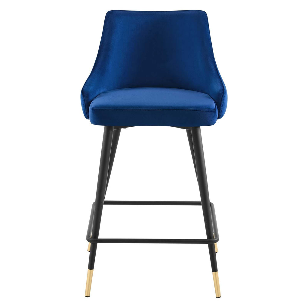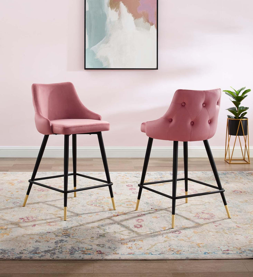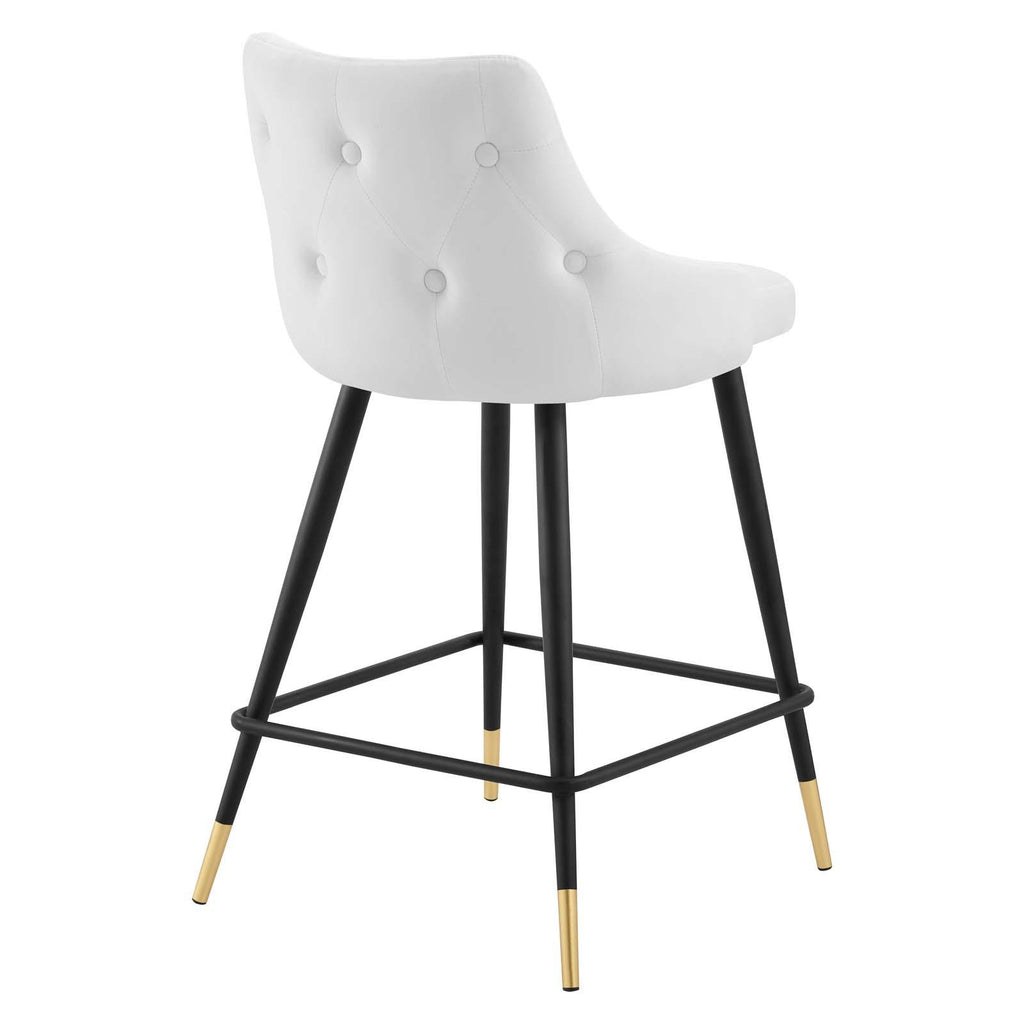 Revitalize dining room or kitchen decor with the Adorn Performance Velvet Counter Stool. Classic button tufting along the stool's exterior and graceful sweeping lines blend seamlessly into the lush comfort of this counter stool. Covered with soft stain-resistant performance velvet, this upholstered counter stool offers a comfortable place to dine with a dense foam padded seat. Sitting on four black tapered legs with gold foot sleeves, Adorn's vintage modern style and glam deco charm makes this counter stool ideally suited for a counter-height bar table or kitchen island, or even as an accompaniment to a drafting desk in the home office. This modern dining counter stool supports up to 300 lbs. and is complete with non-marking foot caps to protect your flooring. No assembly required.