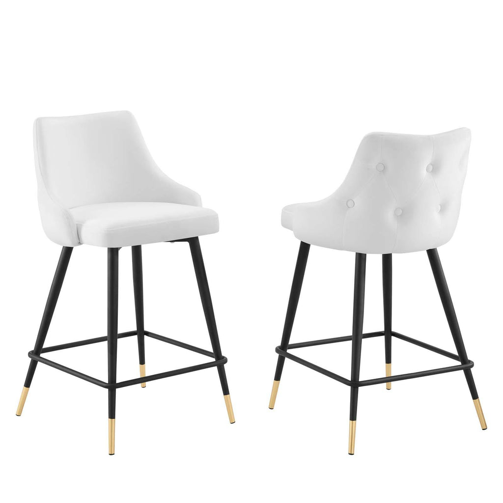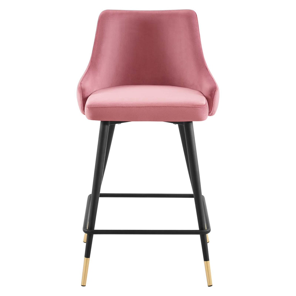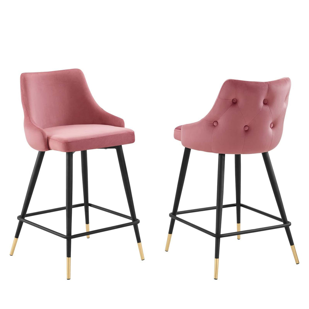 Revitalize dining room or kitchen decor with the Adorn Performance Velvet Counter Stool. Classic button tufting along the stool's exterior and graceful sweeping lines blend seamlessly into the lush comfort of this counter stool. Covered with soft stain-resistant performance velvet, this upholstered counter stool offers a comfortable place to dine with a dense foam padded seat. Sitting on four black tapered legs with gold foot sleeves, Adorn's vintage modern style and glam deco charm makes this counter stool ideally suited for a counter-height bar table or kitchen island, or even as an accompaniment to a drafting desk in the home office. This modern dining counter stool supports up to 300 lbs. and is complete with non-marking foot caps to protect your flooring. No assembly required.