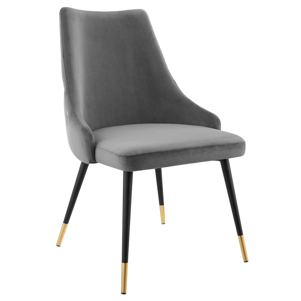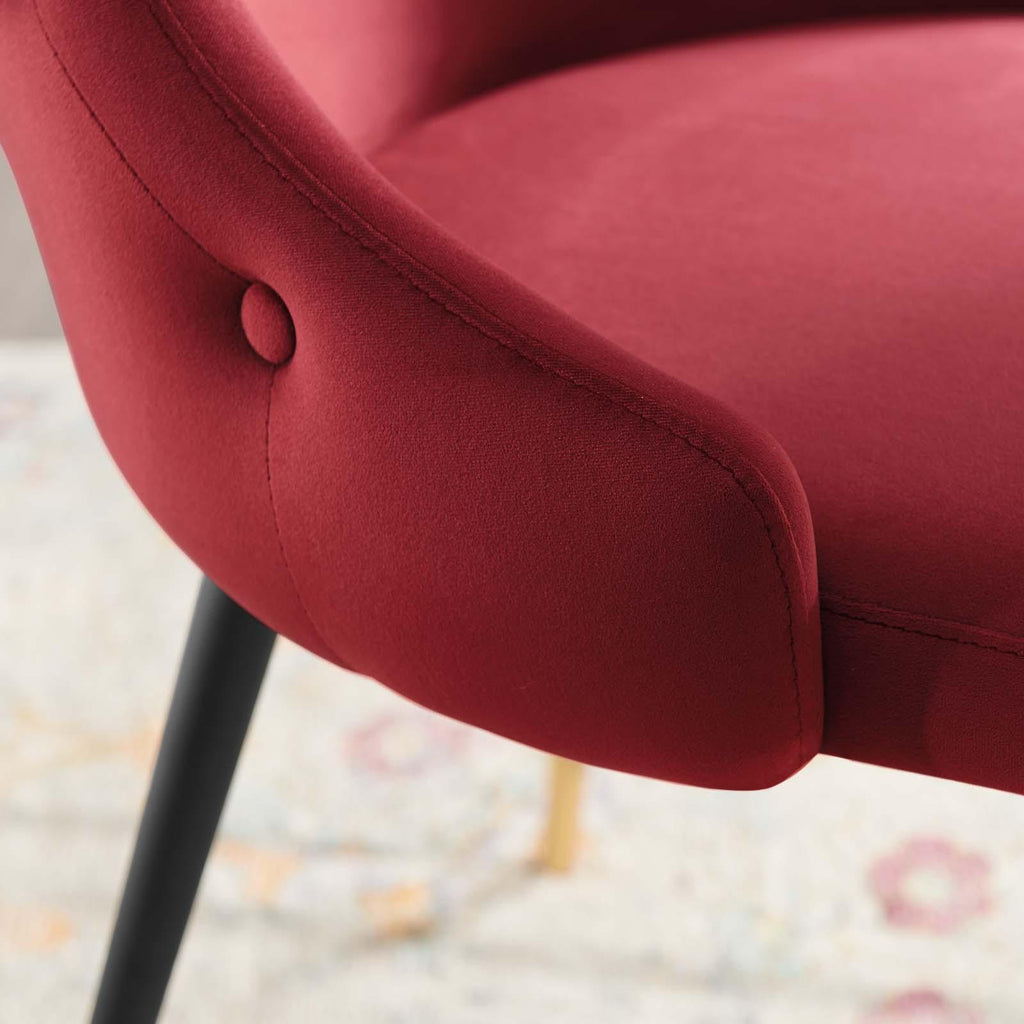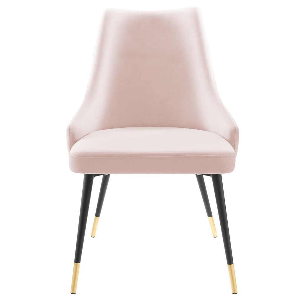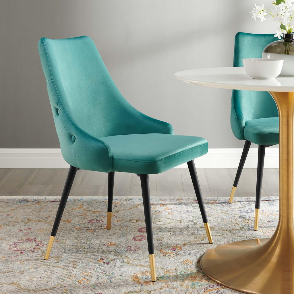 Revitalize dining decor or your living space with the Adorn Tufted Performance Velvet Dining Side Chair. Classic button tufting along the chair's exterior and graceful sweeping lines blend seamlessly into the lush comfort of this dining chair. With soft stain-resistant performance velvet upholstery, this accent chair offers a comfortable place to rest with dense foam padding. Sitting on four black tapered legs with gold foot sleeves, Adorn's versatile vintage modern style and glam deco charm makes this side chair ideally suited for a variety of rooms. Place this velvet chair around the dining table, or use it as an accent chair in the living room, bedroom or entryway, or update your home office seating with use as a cute desk chair. This modern dining chair supports up to 300 lbs. and is complete with non-marking foot caps to protect your flooring. No assembly required. Set Includes: One - Adorn Tufted Dining Side Chair Vintage Modern Accent Dining Chair Performance Velvet Polyester Upholstery Durable Stain-Resistant Fabric Black Tapered Legs Dense Foam Padding Comes Fully Assembled Chair Weight Capacity: 300 lbs. Overall Product Dimensions: 25"L x 22"W x 34"H Seat Dimensions: 18.5"L x 19.5"W x 17.5"H Backrest Dimensions: 14"W x 16.5"H Leg Dimensions: 17.5"H