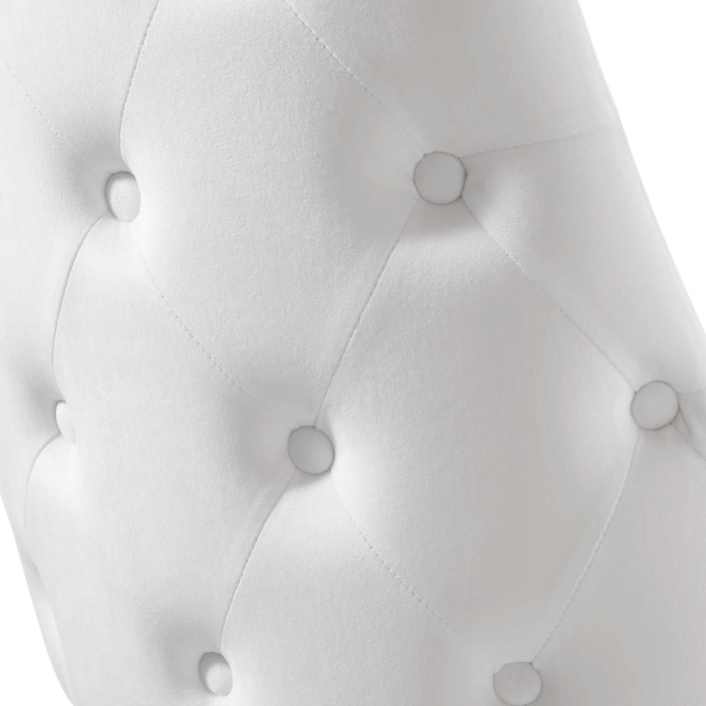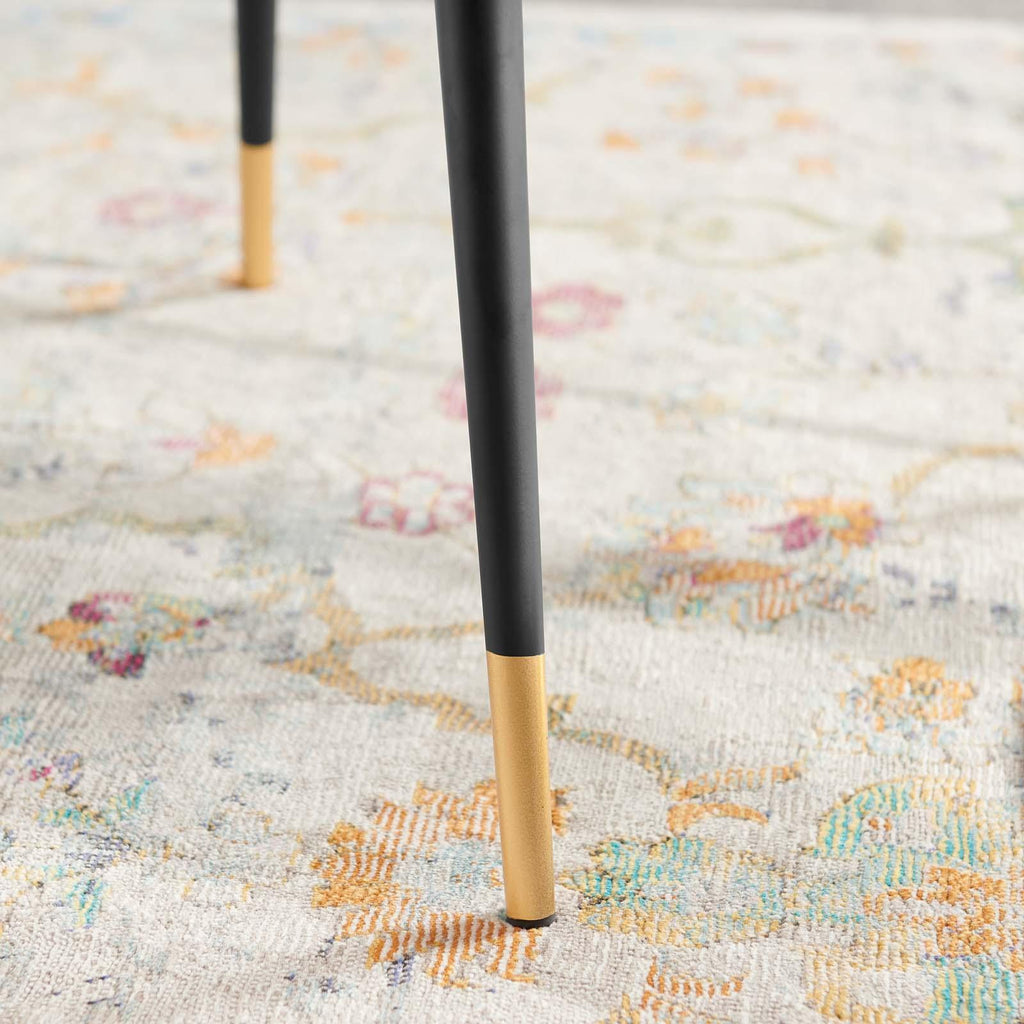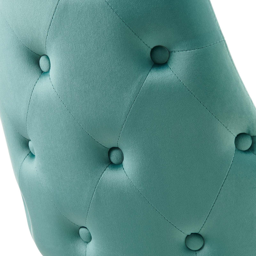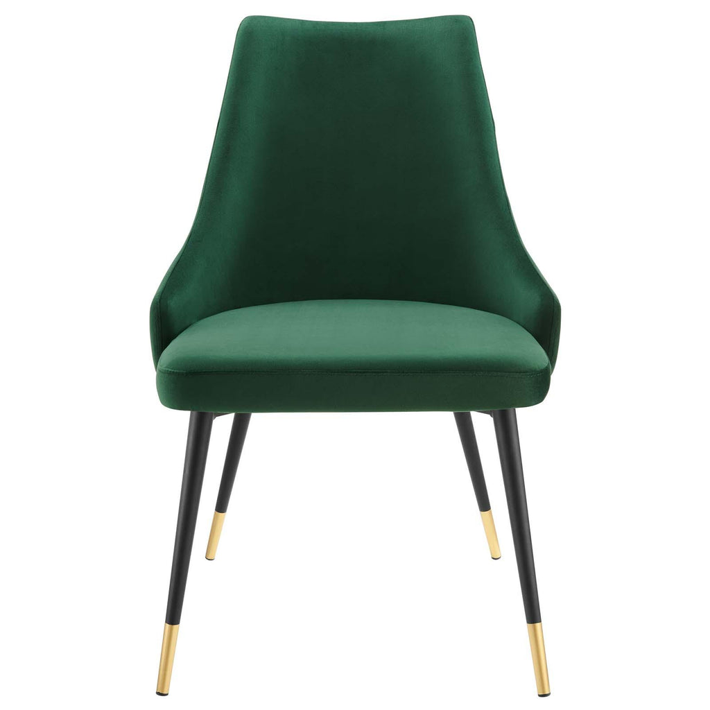 Revitalize dining decor or your living space with the Adorn Tufted Performance Velvet Dining Side Chair. Classic button tufting along the chair's exterior and graceful sweeping lines blend seamlessly into the lush comfort of this dining chair. With soft stain-resistant performance velvet upholstery, this accent chair offers a comfortable place to rest with dense foam padding. Sitting on four black tapered legs with gold foot sleeves, Adorn's versatile vintage modern style and glam deco charm makes this side chair ideally suited for a variety of rooms. Place this velvet chair around the dining table, or use it as an accent chair in the living room, bedroom or entryway, or update your home office seating with use as a cute desk chair. This modern dining chair supports up to 300 lbs. and is complete with non-marking foot caps to protect your flooring. No assembly required. Set Includes: One - Adorn Tufted Dining Side Chair Vintage Modern Accent Dining Chair Performance Velvet Polyester Upholstery Durable Stain-Resistant Fabric Black Tapered Legs Dense Foam Padding Comes Fully Assembled Chair Weight Capacity: 300 lbs. Overall Product Dimensions: 25"L x 22"W x 34"H Seat Dimensions: 18.5"L x 19.5"W x 17.5"H Backrest Dimensions: 14"W x 16.5"H Leg Dimensions: 17.5"H