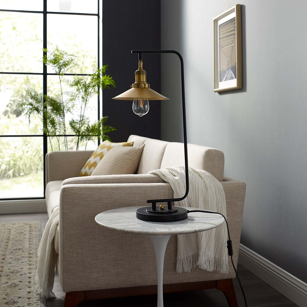 Reach a blend of industrial style and contemporary modernity with the Amenity Table Lamp. With antique vintage charm, this table lamp features a matte black metal round base, sleek rod frame, and an angle adjustable antique brass shade that makes a striking statement. A beautiful accent in the living room, bedroom, entryway, or office, the Amenity table lamp brings golden light to your home or apartment with a single E26 60W light bulb (not included).
