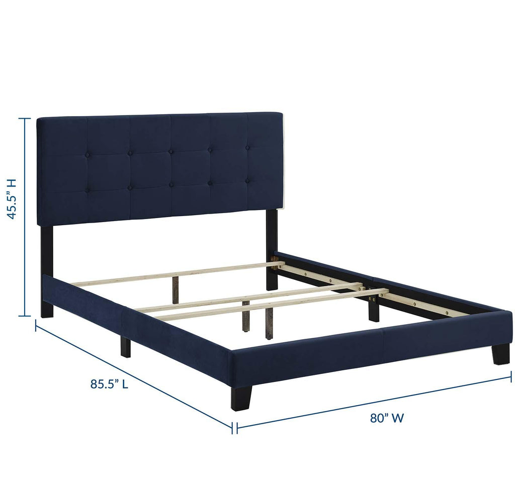 Inspire sweet dreams with a cozy Amira Performance Velvet King Platform Bed. Designed with chic elegance and contemporary style, Amira comes with a stain-resistant performance velvet fabric upholstered base, timeless button-tufted headboard, and wood bed frame and legs, with non-marking foot caps. Complete with a reinforced center beam for maximum stability, Amira King Platform Bed accommodates memory foam, spring, latex, and hybrid mattresses. A sleek and sophisticated centerpiece to the master bedroom or guest suite, this modern bed effortlessly transforms your bedroom decor with its luxe look. Box spring required (not included). Bed Weight Capacity: 800 lbs.