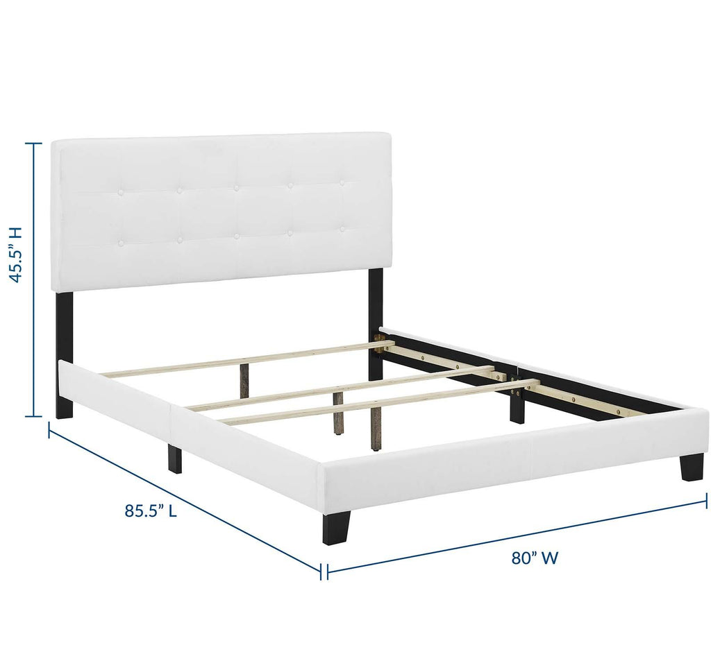 Inspire sweet dreams with a cozy king bed. Designed with chic elegance and contemporary style, Amira comes with a soft polyester fabric upholstered base, timeless button-tufted headboard, and wood bed frame and legs, with non-marking foot caps. Complete with a reinforced center beam for maximum stability, Amira accommodates memory foam, spring, latex, and hybrid mattresses. A sleek and sophisticated centerpiece to the master bedroom or guest suite, this modern bed effortlessly transforms your bedroom decor with its luxe look. Box spring required (not included). Bed Weight Capacity: 800 lbs.