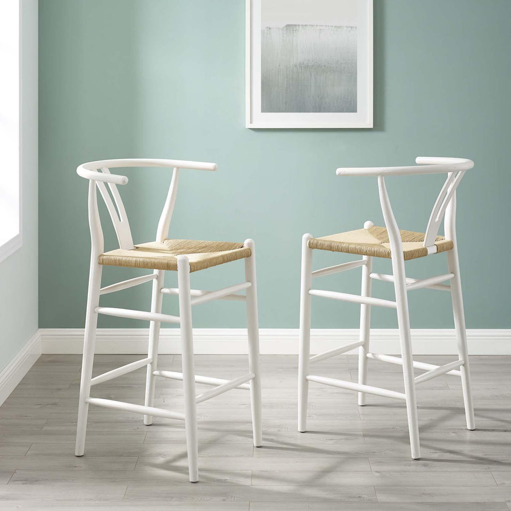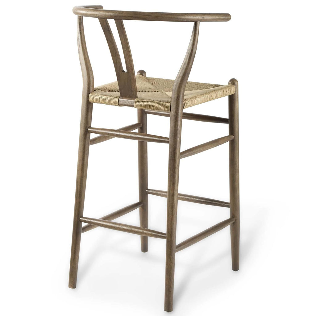 Rustic lines form the flowing frame of Amish Wood Bar Stool Set of 2. Created with a mid-century style, the Amish Bar Stool Set takes the minimalist style into an organic piece bringing natural beauty to your bistro and bar area. Amish features an elm wood half moon armrest, cutaway back, and foot bar supports. A woven paper rope seat ties in a solidly constructed wooden stool for your living room, lounge room, bistro, cafe, and bar area decor. Comes Fully Assembled.