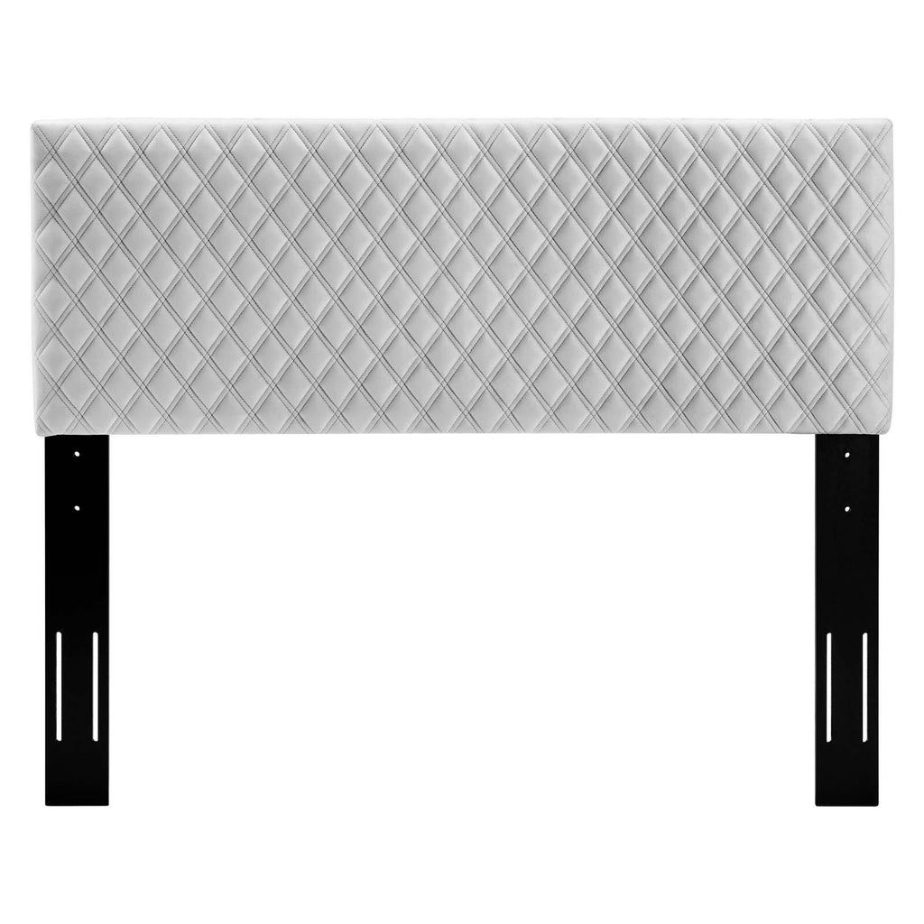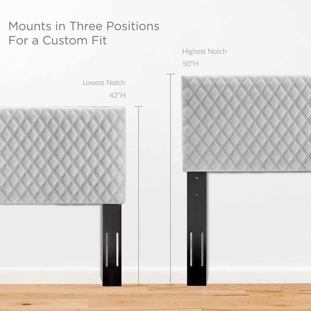 Customize your master suite or guest bedroom space with the Angela Tufted Diamond Lattice Performance Velvet Upholstered King Headboard. The elegant textured diamond pattern combines with the soft and stain-resistant performance velvet upholstery for a standout headboard for king and California king size beds. The Angela King Headboard is height adjustable with three mounting positions. Solidly constructed from wood and plywood, dense foam padding supports this king and Cali king headboard for a comfortable experience reading, reclining, or conversing in bed.