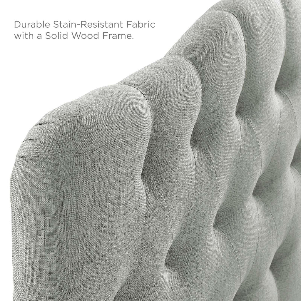 Instill soft tones and a meaningful design with the Modway Annabel Button Tufted Linen Fabric Upholstered King Headboard. Deep inset buttons adorn this magnificent centerpiece for your bedroom d�cor. Annabel King Headboard is made from fiberboard, plywood, and fine linen fabric upholstery for a construction that is both lightweight and long-lasting. Carefully crafted with flowing contours and a richly rewarding design, this striking headboard for King beds transforms your sleeping space decor. Set Includes: One - Annabel King Headboard Elegantly tufted button headboard Fits king size beds Deep inset buttons Fine polyester upholstering Fiberboard and plywood frame Overall Product Dimensions: 5"L x 78.5"W x 50.5 - 58"H Bedframe Mounting Location: 4.5 - 8.5"H Mounting Location A - Height to Top of Headboard: 58"H Mounting Location A - Height to Bottom of Headboard: 30.5"H Mounting Location B - Height to Top of Headboard: 55.5"H Mounting Location B - Height to Bottom of Headboard: 28"H Mounting Location C - Height to Top of Headboard: 53"H Mounting Location C - Height to Bottom of Headboard: 25.5"H Mounting Location D - Height to Top of Headboard: 50.5"H Mounting Location D - Height to Bottom of Headboard: 23"H