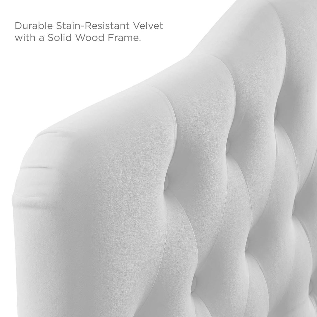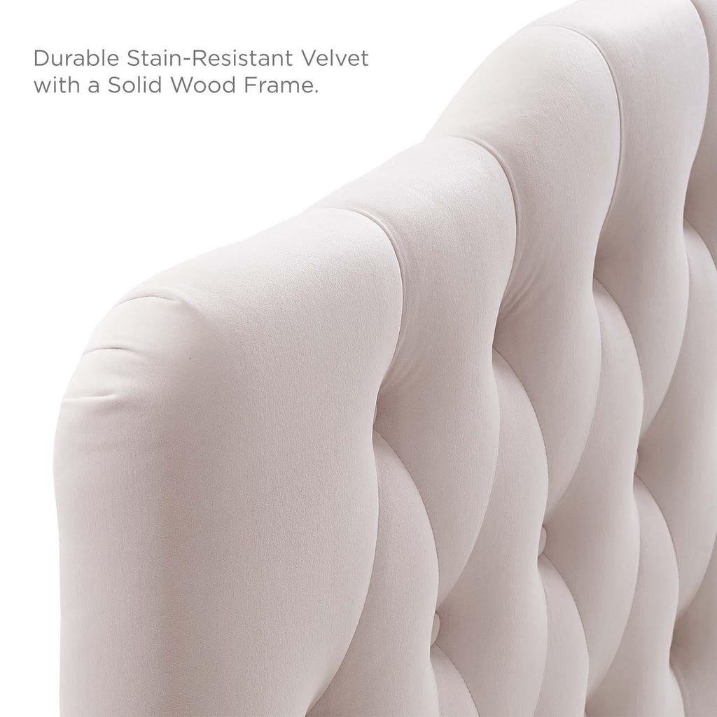 Follow the gentle curves and winsome style of the Annabel Diamond Tufted Performance Velvet Queen Headboard. Annabel features elegant diamond tufting within a slightly curved silhouette for plush vintage glamour and ageless charm. A delightful focal point for any master suite or guest room, this upholstered velvet headboard for queen bed frames provides a soft, stain-resistant update for luxurious comfort while relaxing, reading, or conversing in bed. Solidly constructed from plywood and fiberboard with dense foam padding, this queen size velvet headboard comes with five mounting positions that are height adjustable from 45" - 52.5".