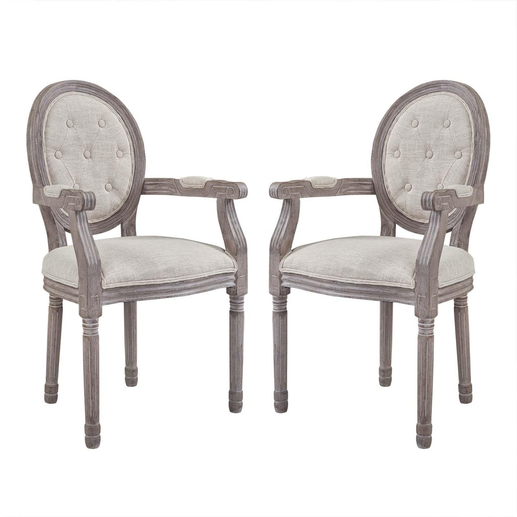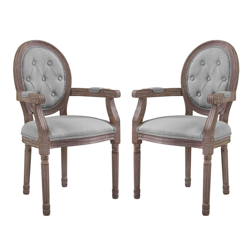 Revel in the whispered opulence of the Arise French Vintage Dining Accent Armchair. Featuring a fluted wood frame, button tufted diamond trim, elegant welting, dense foam padding, an upholstered fabric seat, this oval back dining or accent armchair elegantly blends old world charm with modern farmhouse intrigue. Designed with a weathered vintage French look and an undeniable appeal, Arise Dining Armchair supports up to 331 pounds and comes with foot pads to preserve flooring. Comes fully assembled.